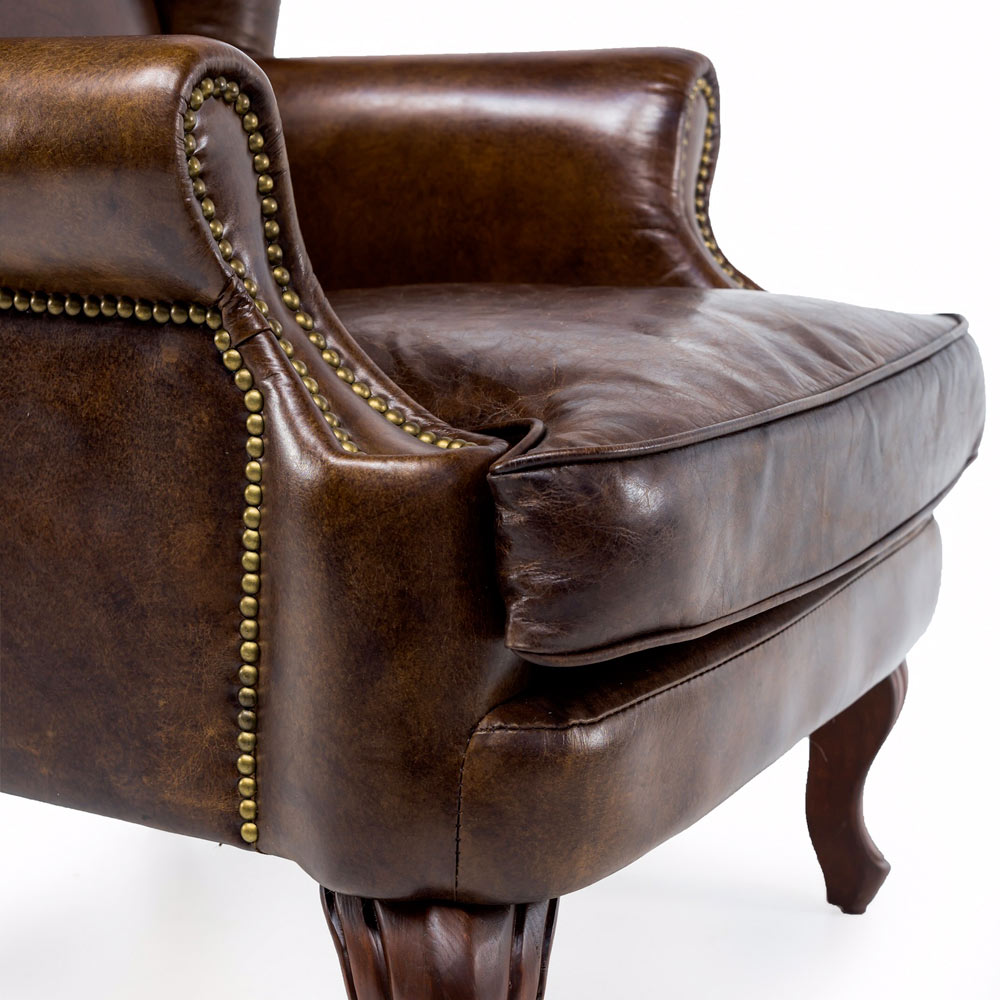 Sillón de salón en piel auténtica de color marrón oscuro , con un estilo clásico inglés.