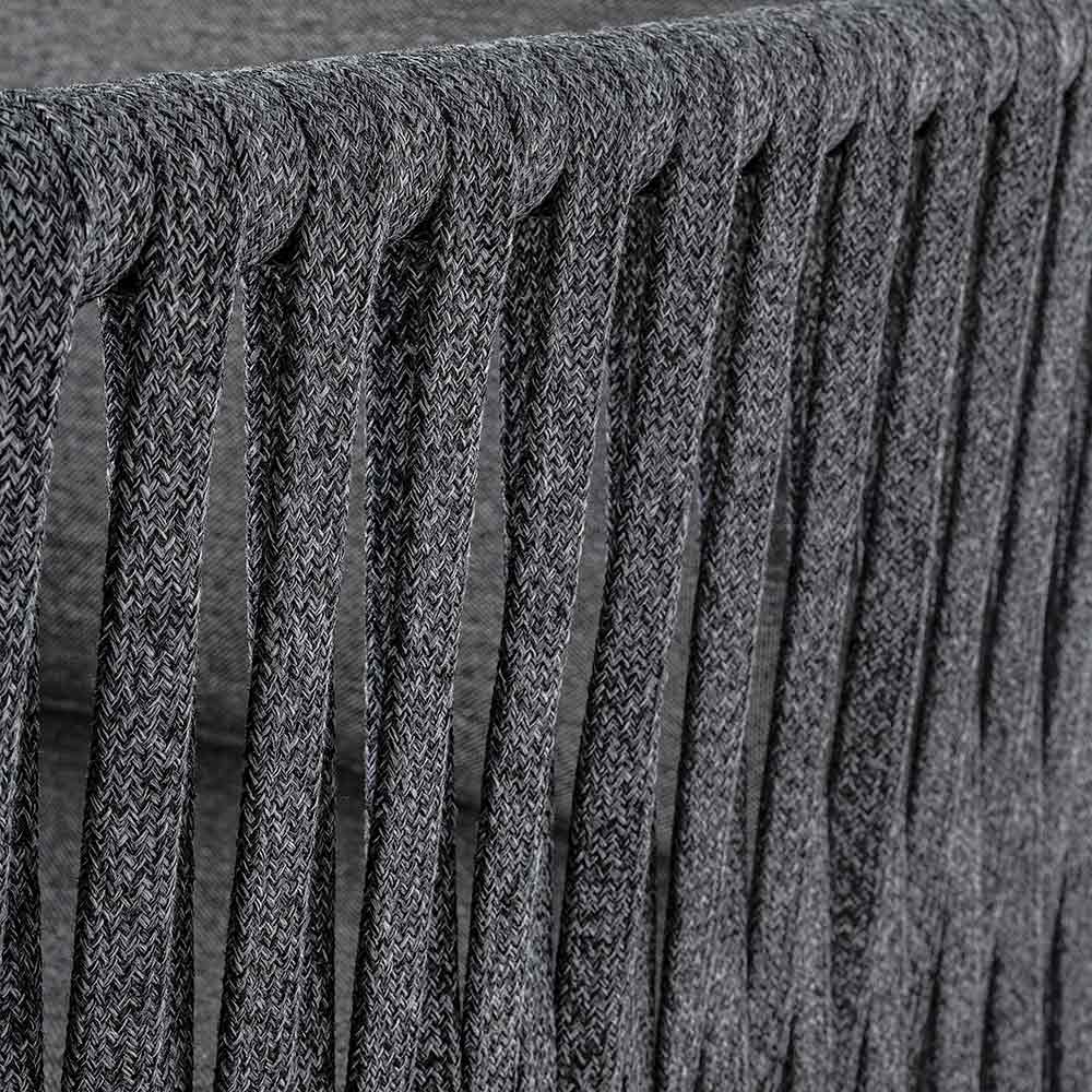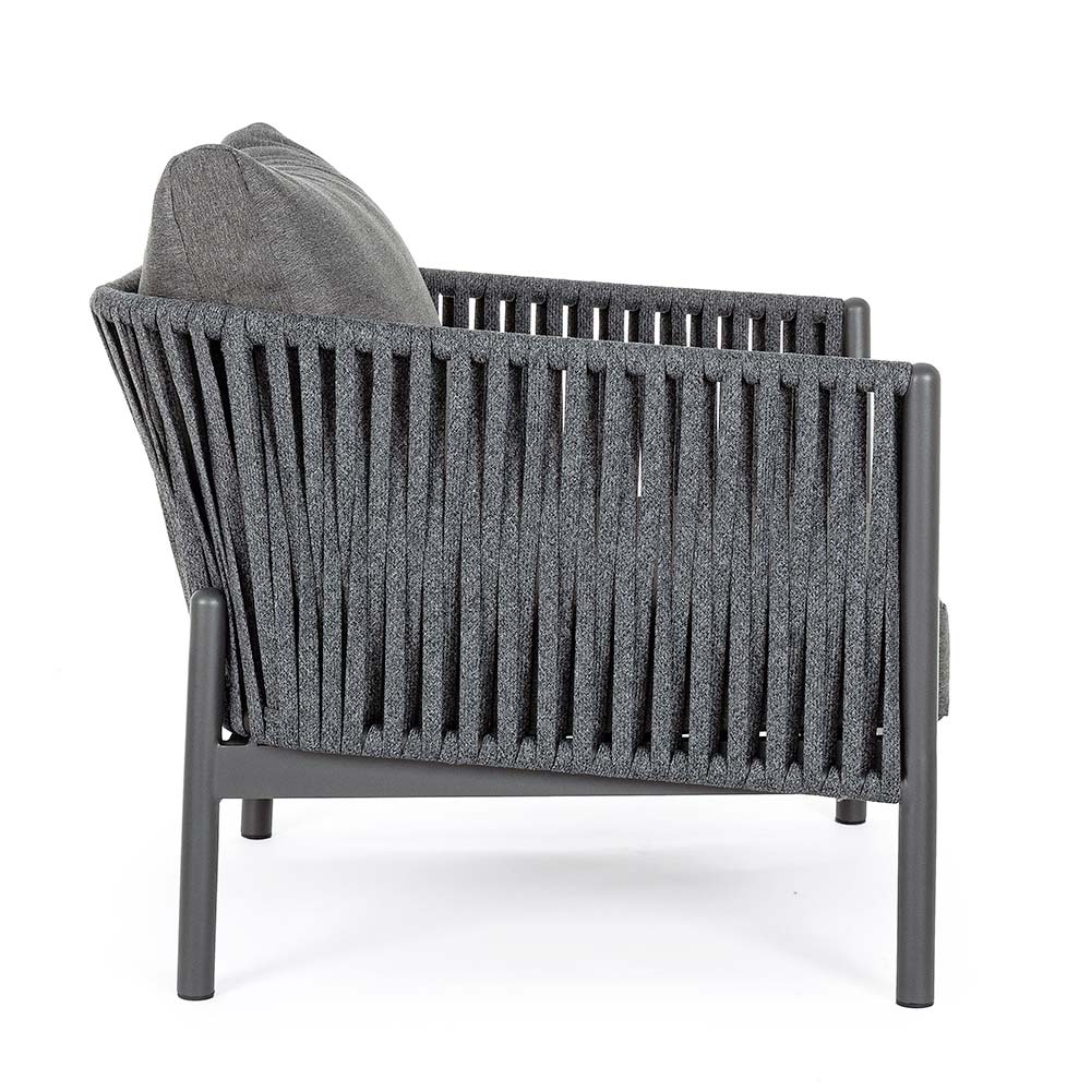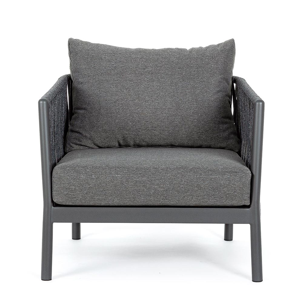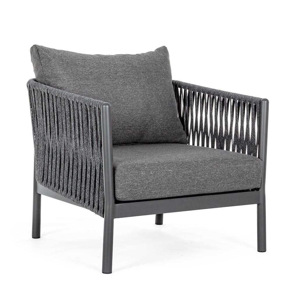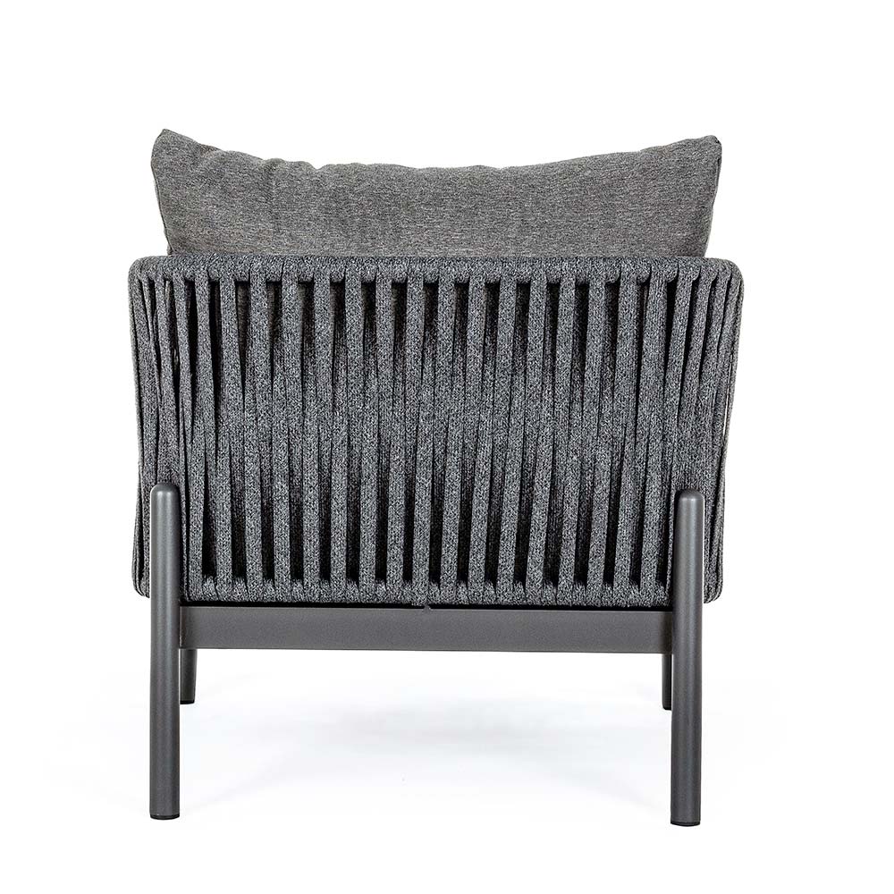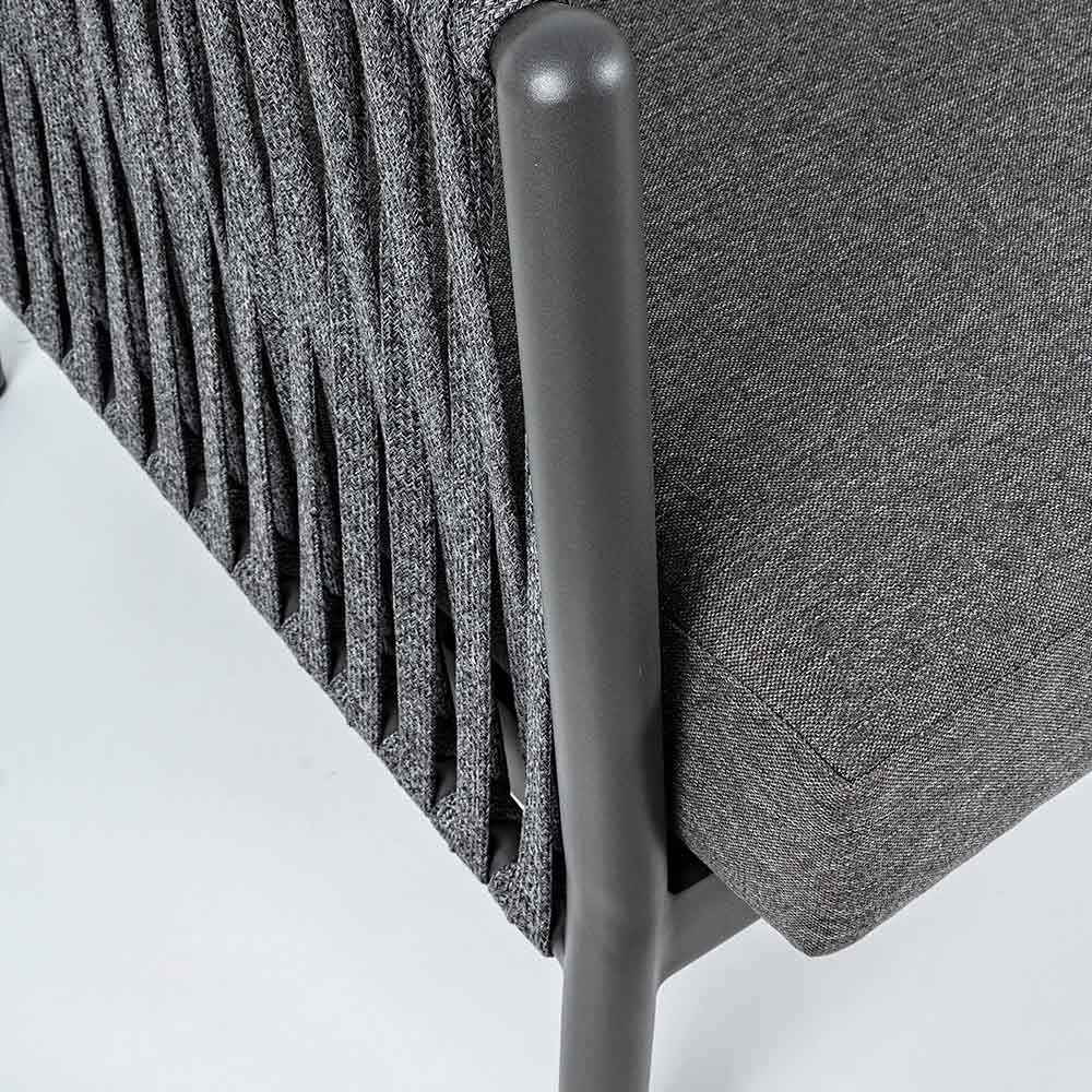 Sillón de exterior con estructura de aluminio y respaldo de cuerda trenzada.