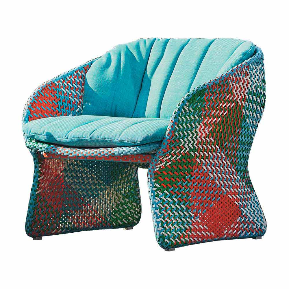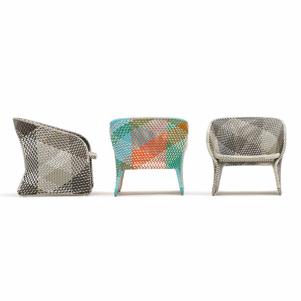 fibra sintética de diferentes colores, que crean fondos cromáticos dinámicos. Sus volúmenes están diseñados para garantizar la máxima estabilidad y un excelente soporte para la espalda y los brazos.