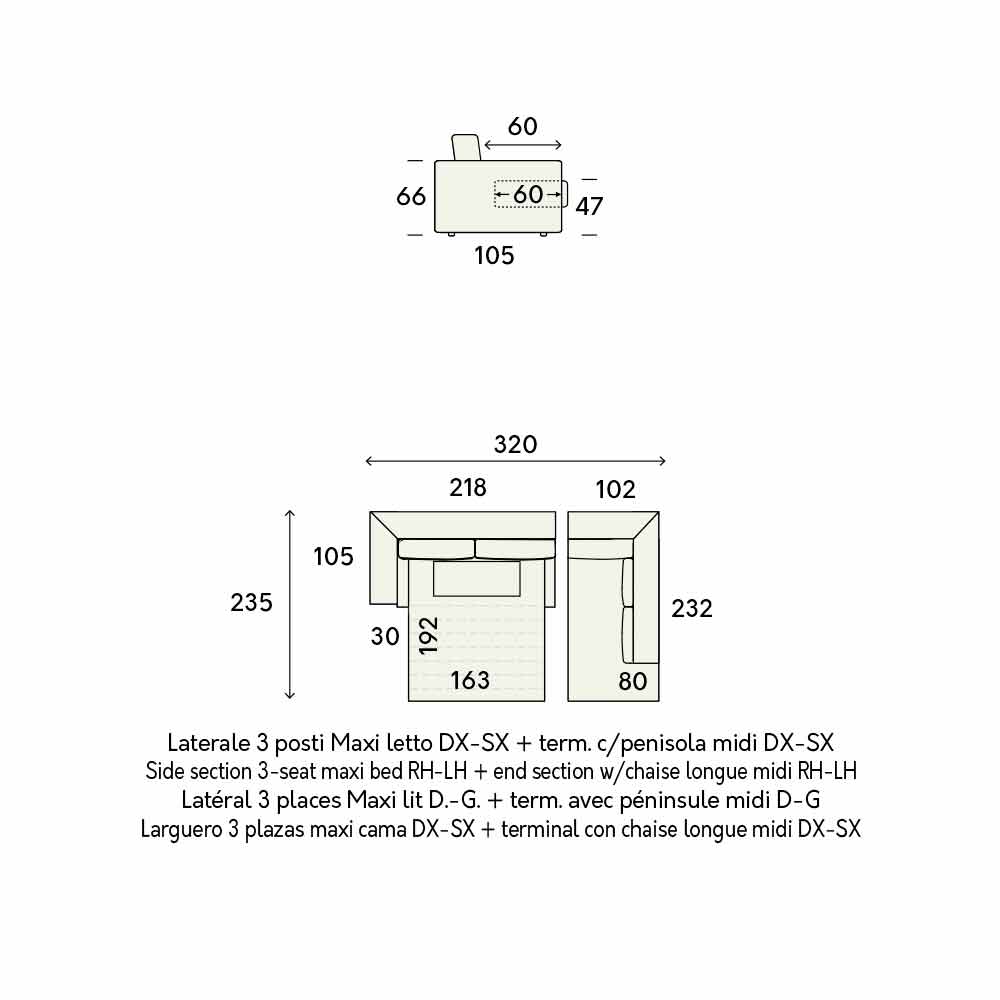 - L 320 x P 235 x H 85 cm (colchón: L 163 x P 192 x H 11 cm).