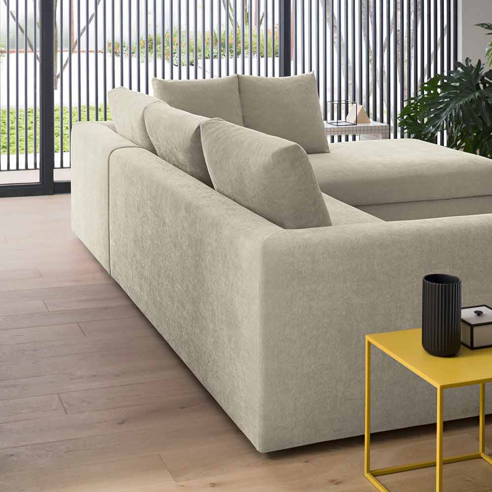 sofá de tamaño familiar sumamente elegante y acogedor enriquecido por la gran chaise longue que ofrece el confort ideal para disfrutar de maravillosas veladas con amigos o dejarse mimar por el cálido y suave abrazo de su acogedor diseño. Rápido y fácil de preparar, este sofá se transforma en una