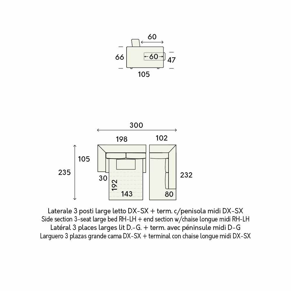 - L 300 x P 235 x H 85 cm (colchón: L 143 x P 192 x H 11 cm):
