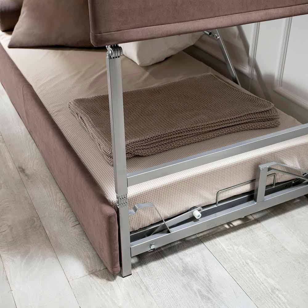 Sofá cama litera tapizado en tela marrón con diseño moderno Made in Italy.