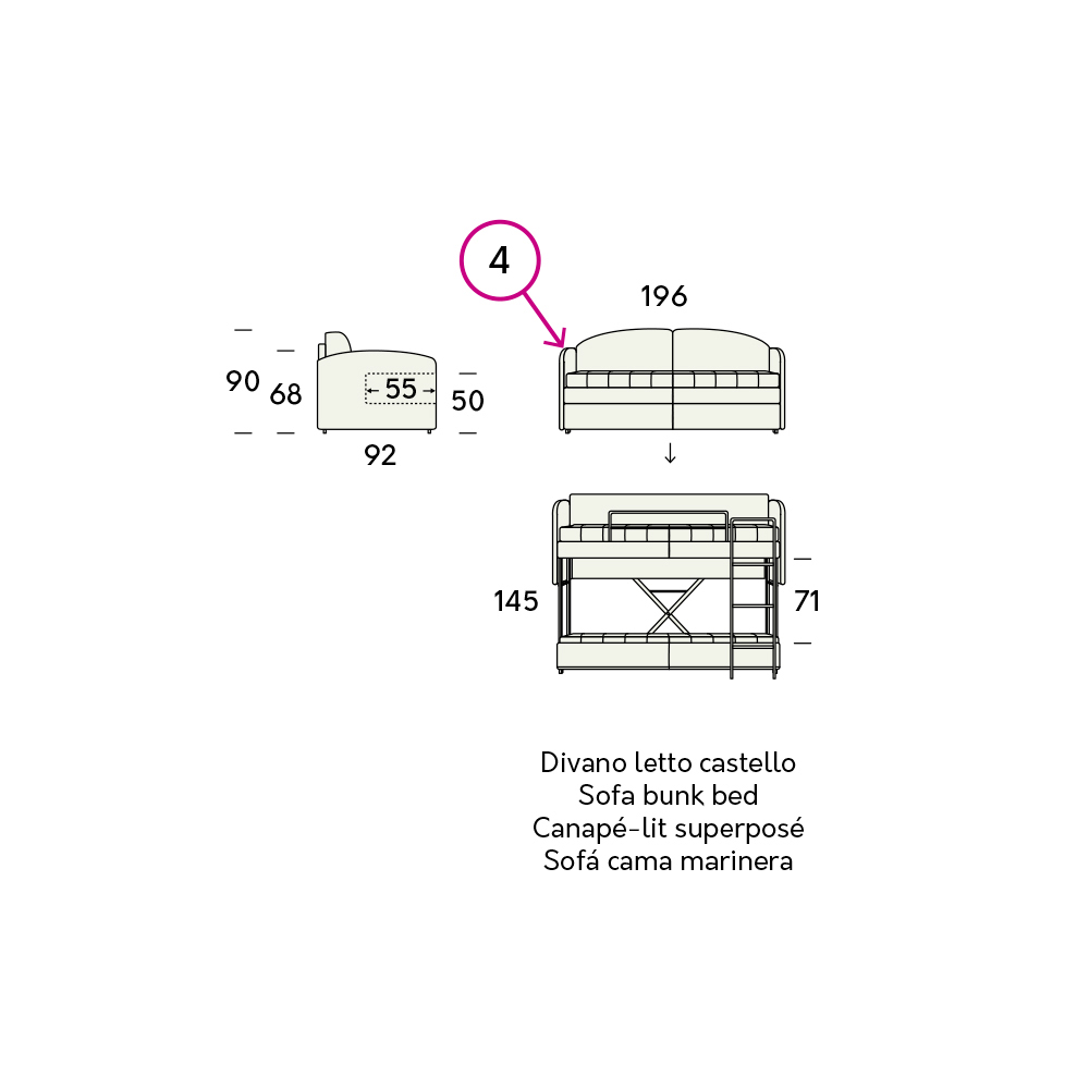 máximo confort y tranquilidad gracias al sistema de apertura con tres dispositivos de seguridad que transforman la cama en sofá y viceversa y a la red que sobresale 30 cm para facilitar y agilizar la preparación de la cama inferior. Para volver a cerrarlo bastará con liberar los dos soportes laterales, que permanecerán bloqueados hasta que también se suelte el tope central. El sofá cama también está equipado con una práctica escalera y barandilla para una mayor garantía de seguridad.