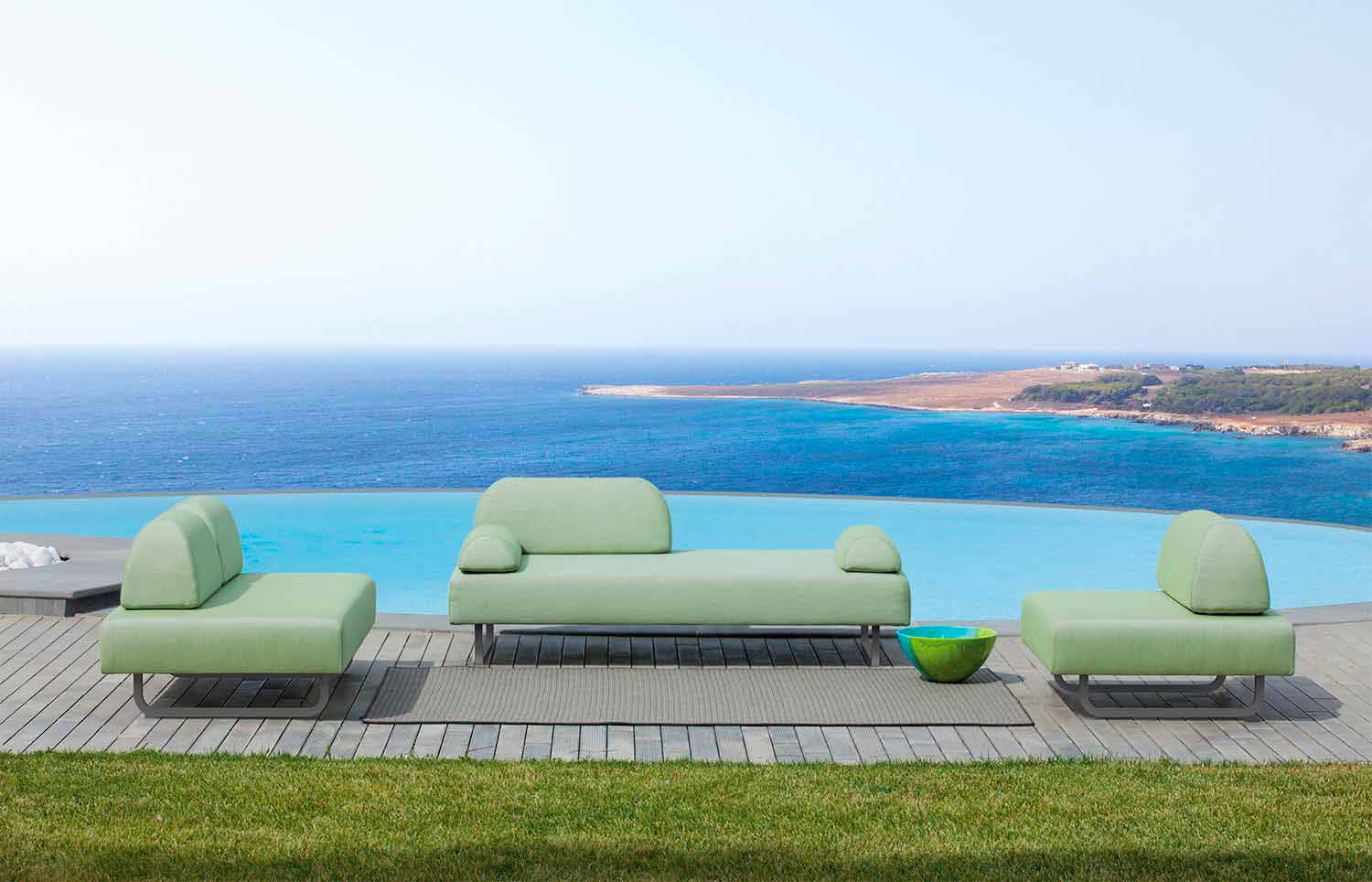 Sofá de exterior de diseño de tres plazas en hierro galvanizado pintado con polvos y tejido acrílico 100% teñido. Fabricado en Italia.