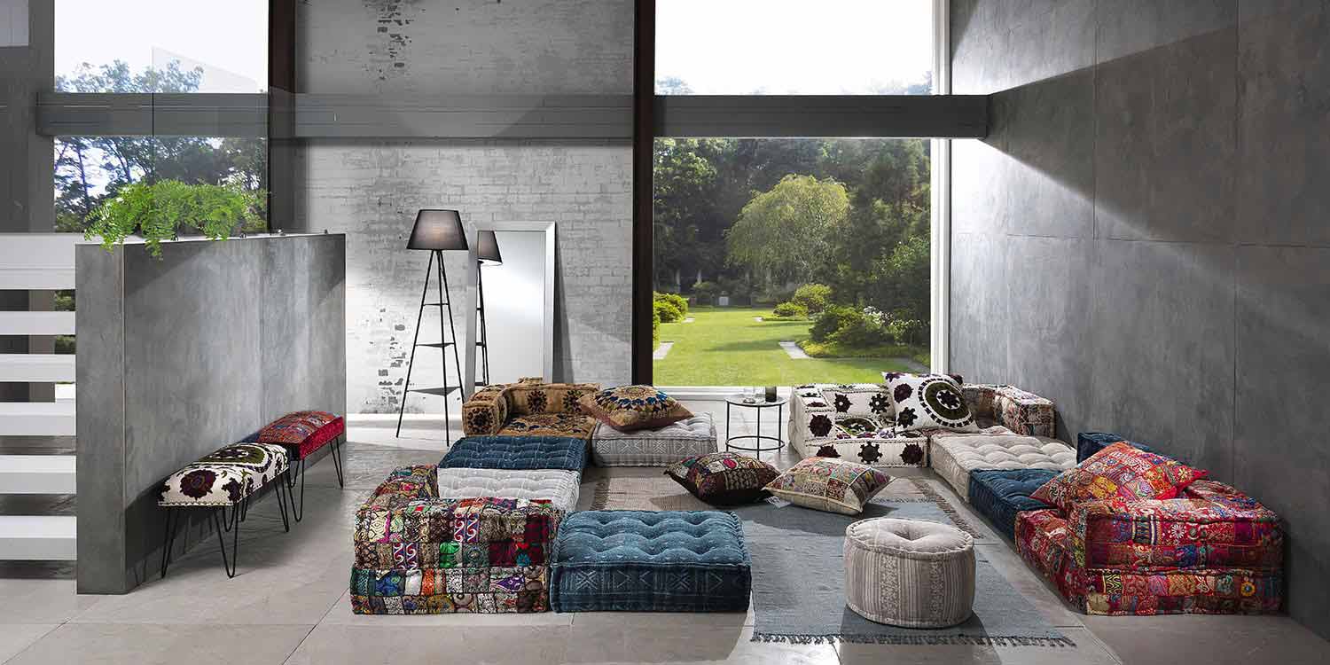 Sofá de dos plazas de diseño étnico en tela de colores.