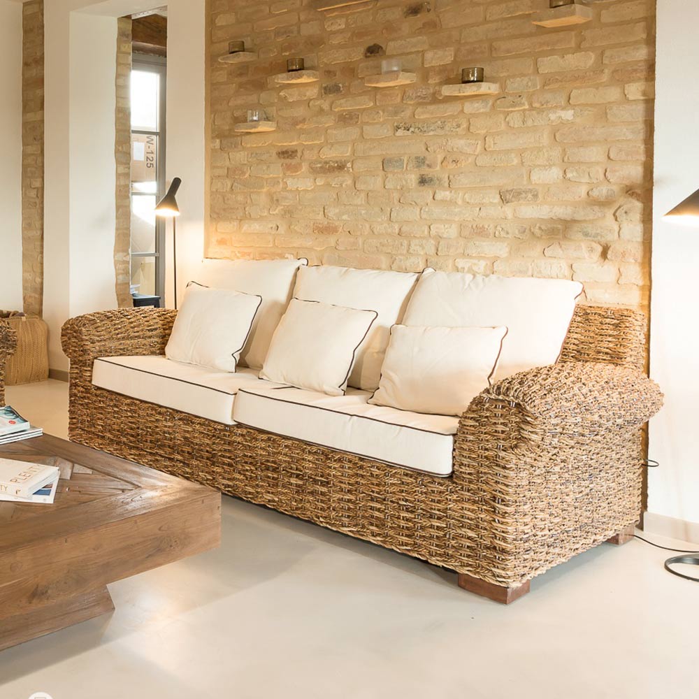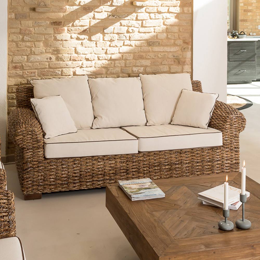 Sofá de 2 o 3 plazas de exterior fabricado en abacá natural tejido a mano con cojines incluidos en el acabado Ecruy pipingchocolate .