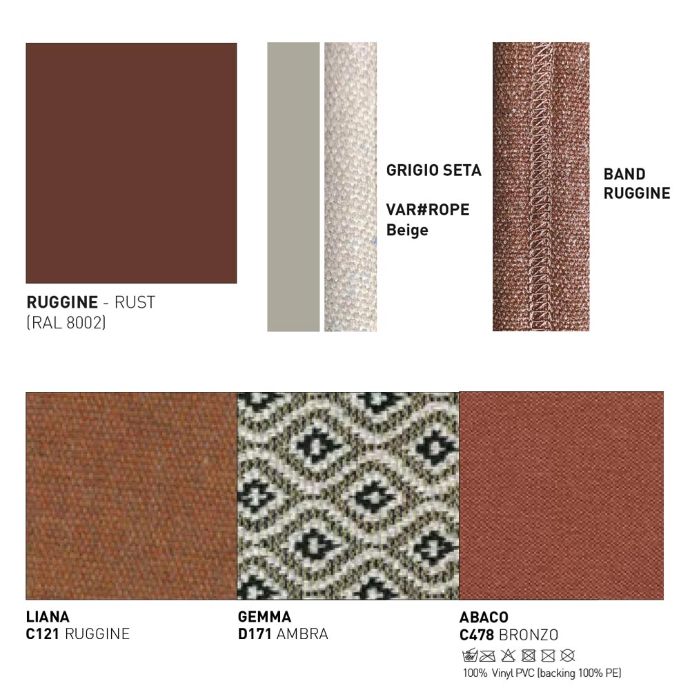 Sofá de jardín de 3 plazas fabricado en Italia con estructura de aluminio pintado con polvos epoxi color óxido , respaldo tejido a mano con banda color óxido, cojín del asiento con acolchado dryfeel y 8 cojines de respaldo incluido. Este mueble de estilo moderno y original ha sido diseñado para satisfacer la vista con su estética elegante garantizando al mismo tiempo un auténtico confort .