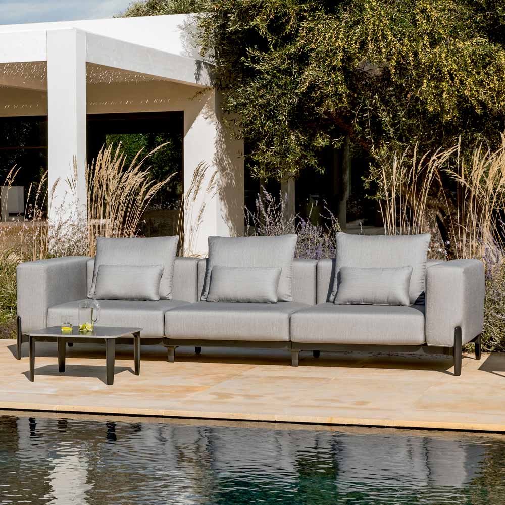 Sofá de diseño exterior de 3 plazas en aluminio y cojines en tejido impermeable, de alta calidad made in Italy.