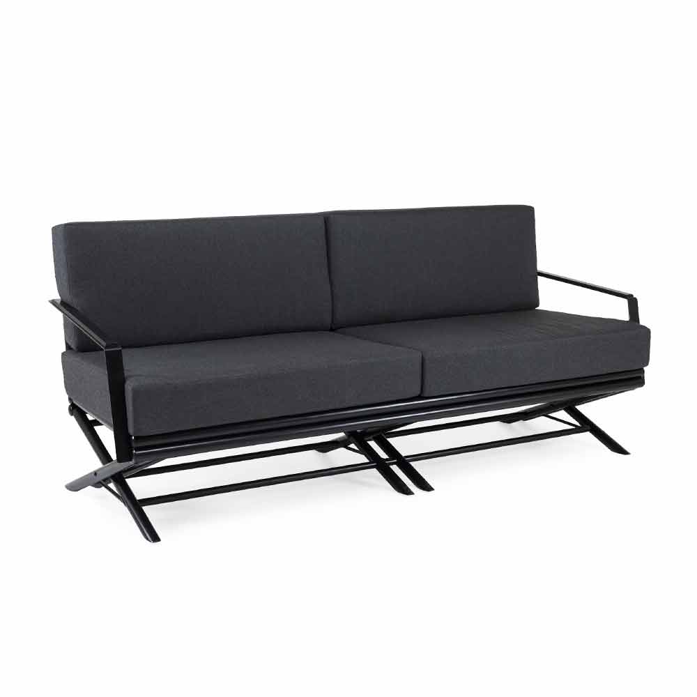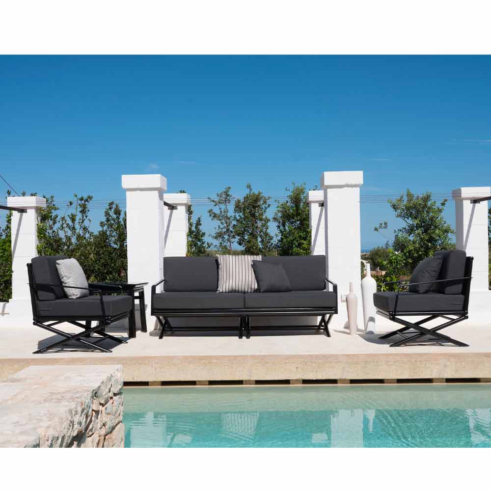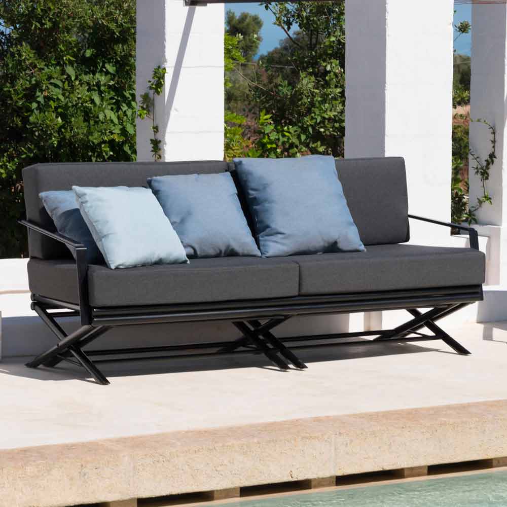 Sofá de exterior de 3 plazas fabricado en madera natural o negra y cojines de tela, diseño de lujo made in Italy.