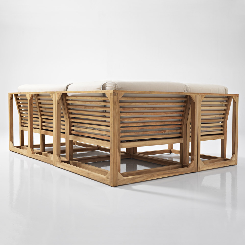 No recomendamos colocar muebles de teca nuevos en el exterior sobre suelos de piedra porosa, al menos hasta que el proceso de aparición de aceite haya remitido. No recomendamos dejar los cojines en contacto directo con las superficies de teca durante este proceso, ya que lo más probable es que se manchen (los tejidos manchados con aceite de teca natural aún pueden limpiarse con agua y jabón neutro). La cantidad de aceite que sale de la teca durante los primeros meses será más abundante y, por tanto, más propensa a causar manchas en superficies y tejidos.