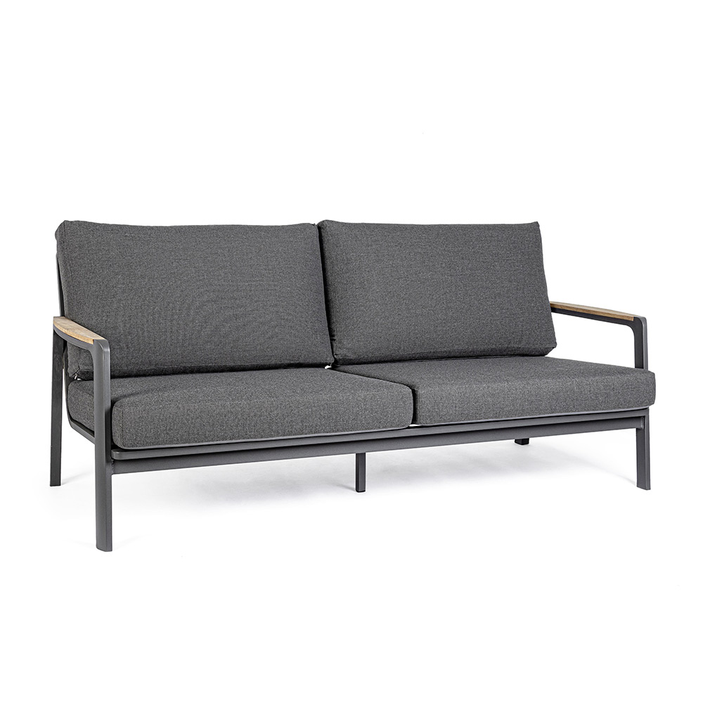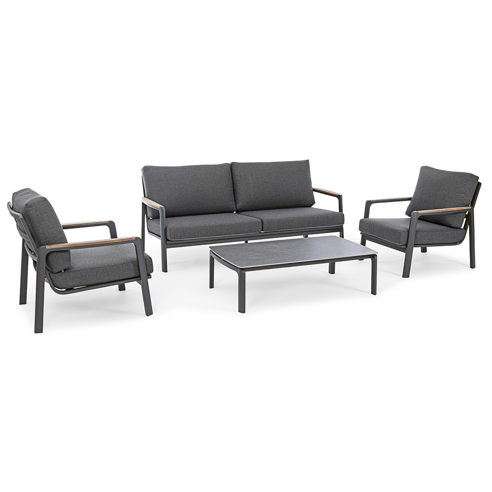Estructura de aluminio pintado en polvo (poliéster). Apoyabrazos con inserciones de teca. Cojines de asiento y respaldo desenfundables con tejido acrílico.