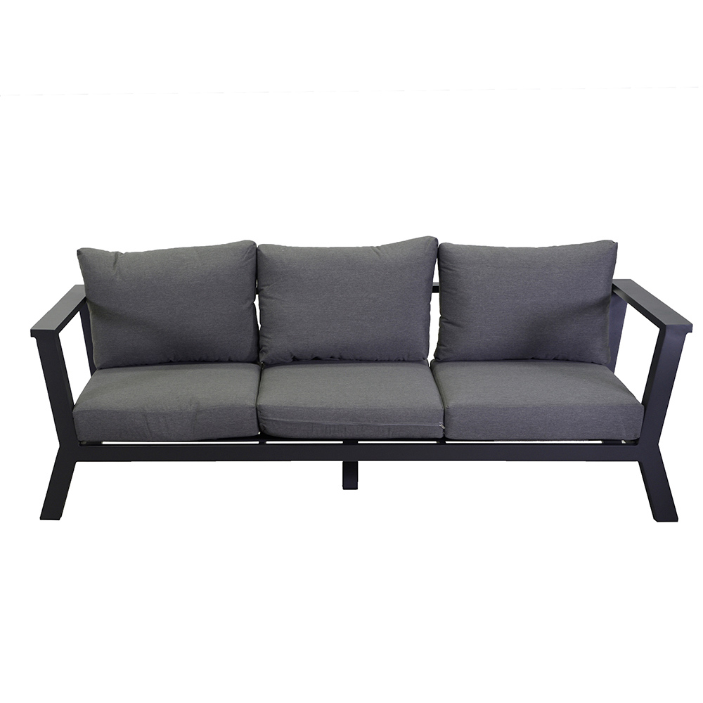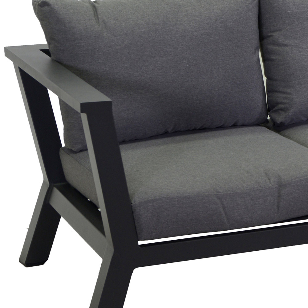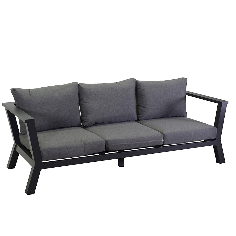 Este sofá con estructura de aluminio con revestimiento en polvo antracita es el epítome de la elegancia moderna y la funcionalidad . Perfecta para cualquier espacio exterior, ofrece un asiento espacioso y cómodo, enriquecido con cojines de tela gris que garantizan el máximo confort. Estos cojines, además de ser estéticamente agradables, son repelentes al agua y extraíbles , garantizando un fácil mantenimiento y una larga vida útil.