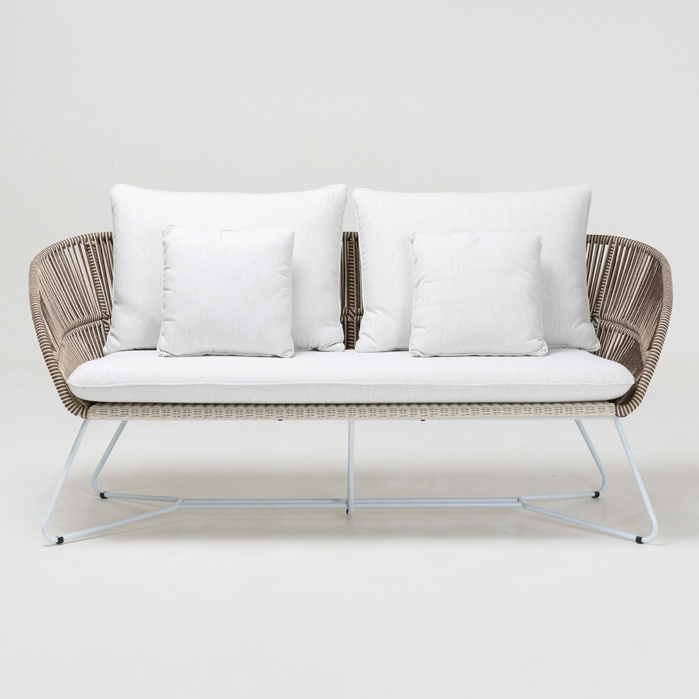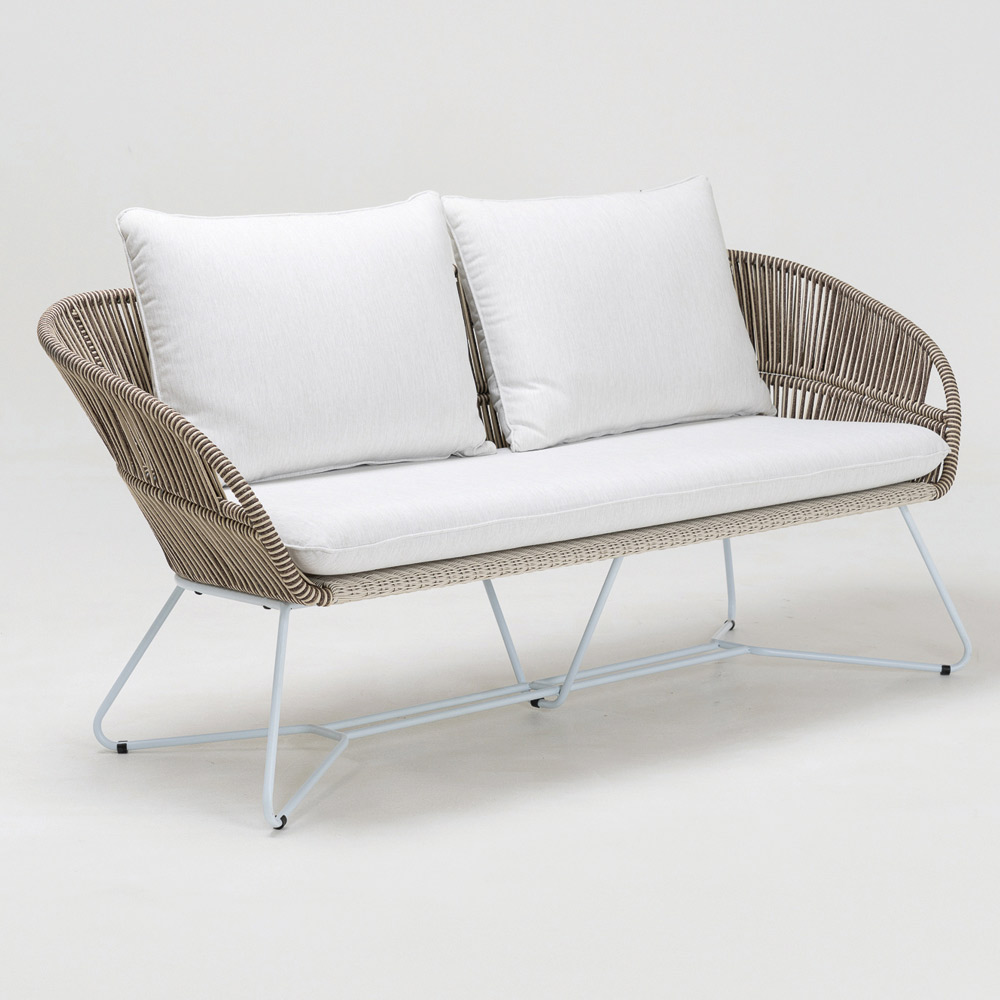 Sofá de exterior fabricado con estructura de aluminio, tejido de Olefina/PP ROPE con acabado bicolor blanco perla y capuchino y cojín de asiento y 2 cojines de respaldo en tejido de exterior en color Off White.