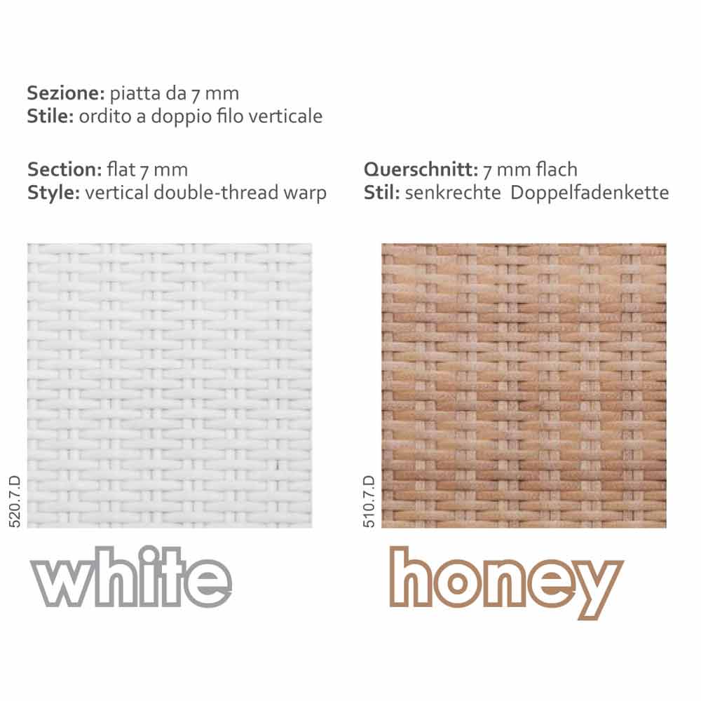 - Fibra de Polietileno HDPE (fibra sintética correspondiente a la fibra natural rattan, dotada de un tacto similar al de la fibra natural).