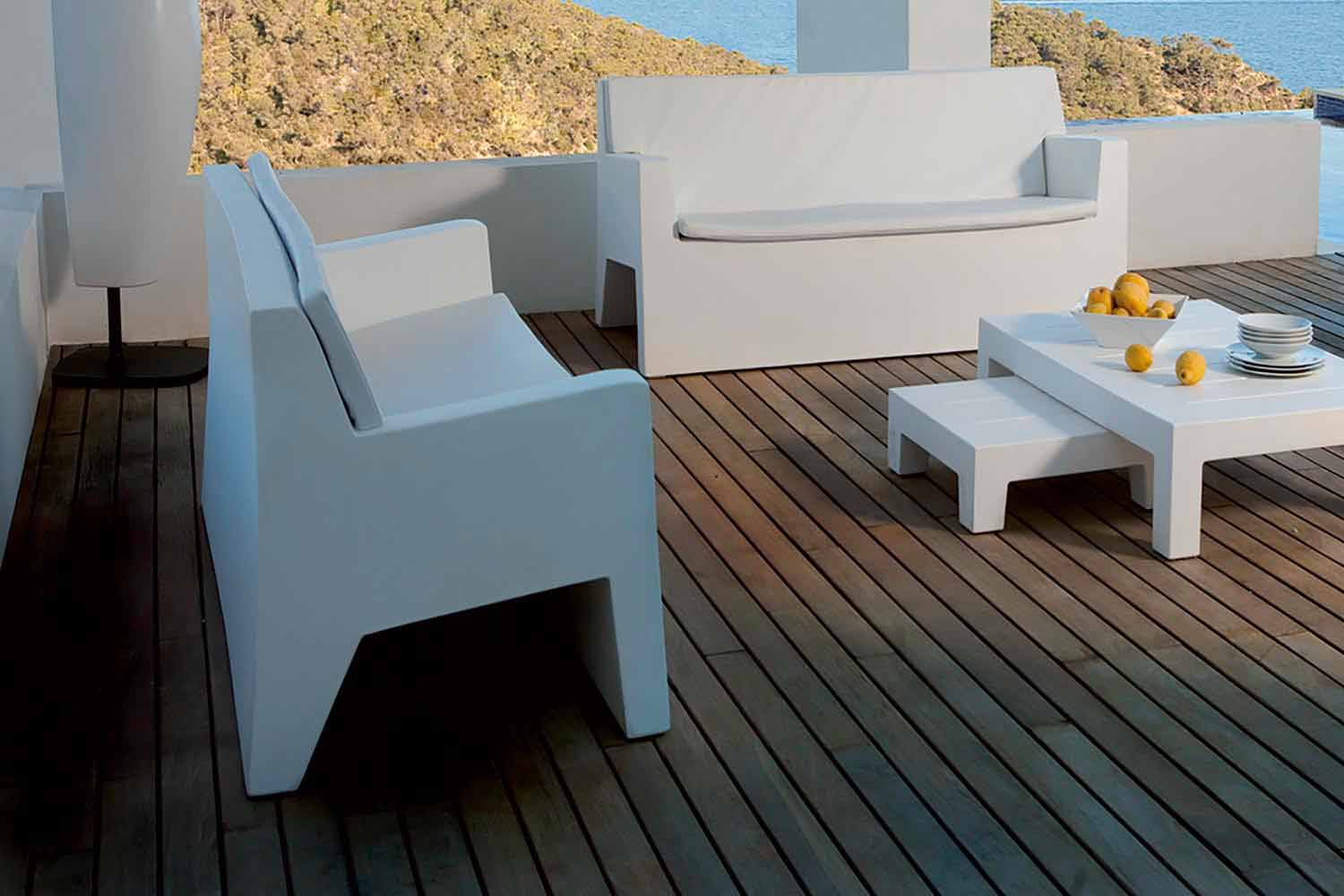 La colección Jut by Vondom está diseñada para espacios exteriores e interiores. Las líneas con formas puras y rectilíneas, reflejan la inspiración mineral y el refinamiento de su técnica que crea productos sin precedentes para muebles de exterior. La ergonomía, la funcionalidad y la ecología son otras características clave de la Jut. El material innovador y reciclable se ocupa de las demandas máximas del mercado para garantizar un uso duradero en apoyo de las condiciones atmosféricas más extremas que mantienen sus colores durante toda su vida útil.