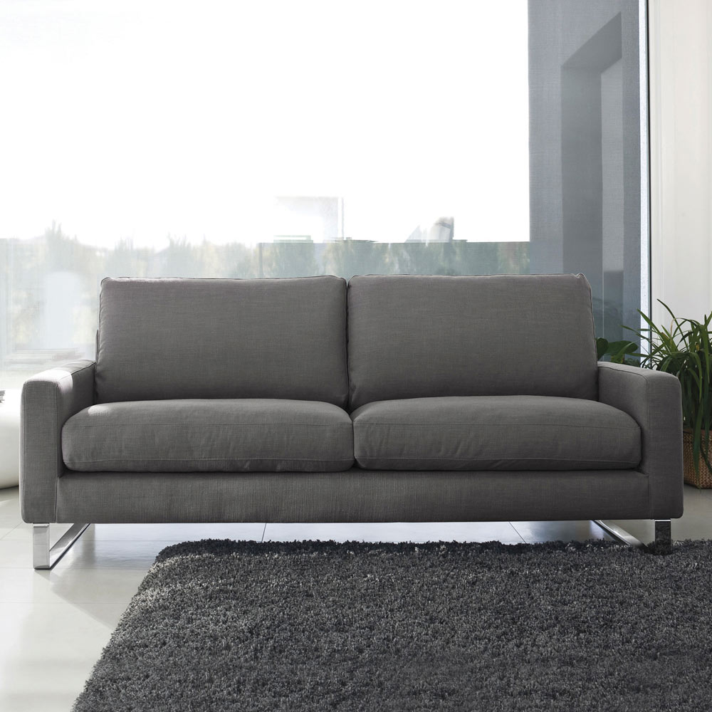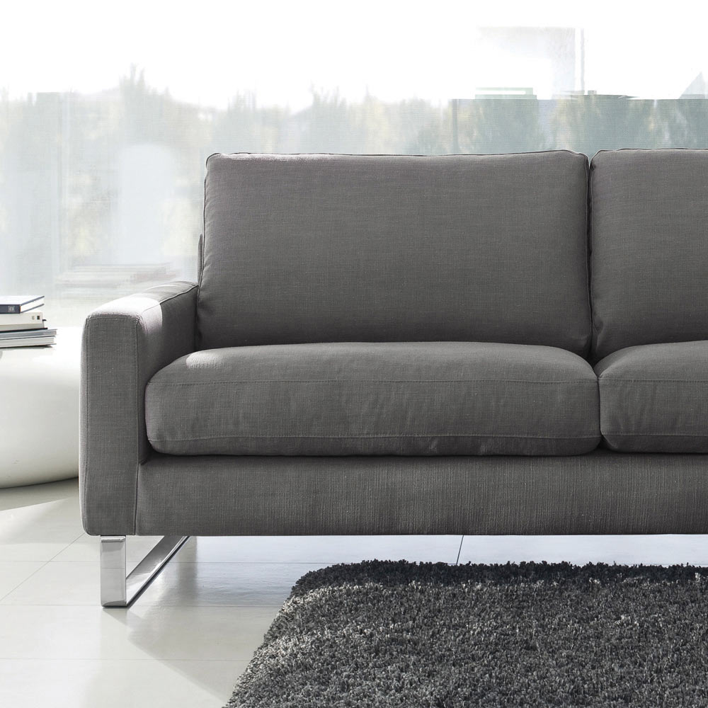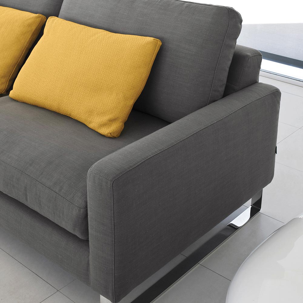 de trineos de metal cromado. El sofá encarna la esencia del minimalismo transformado en funcionalidad. Con su diseño único, ofrece comodidad y elegancia, prometiendo estar siempre a la altura de los tiempos en cuanto a estética y confort. La amplia gama de tapizados y colores lo convierte en un mueble versátil para cualquier ambiente.