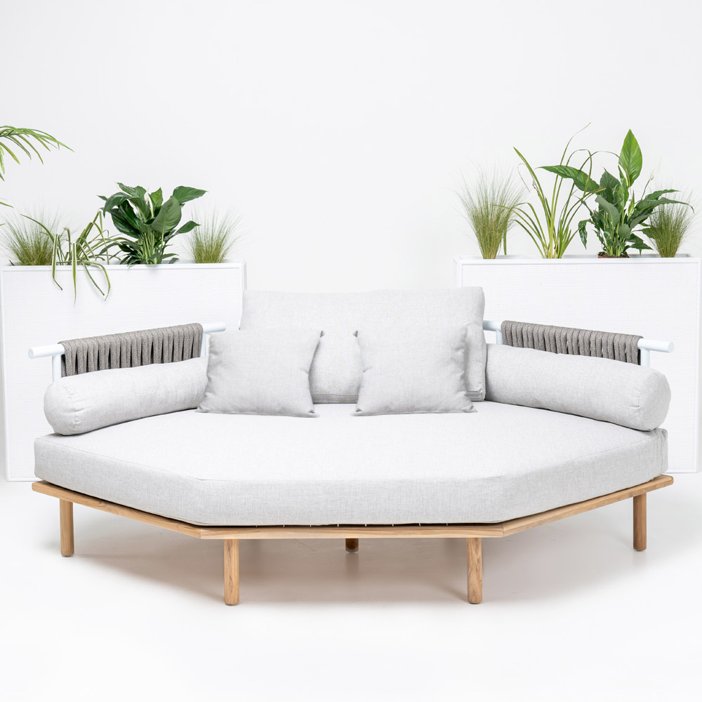 Sofá esquinero hexagonal de jardín en teka, respaldos de aluminio y tejido en Olefina/PP ROPE y cojín