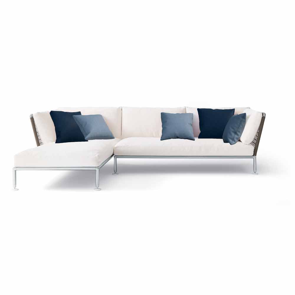 Se puede colocar en un rincón de la terraza, en el jardín o en todos los espacios donde poder recrear momentos de serenidad y relajación sin renunciar al estilo inconfundible del made in Italy, el sofá rinconera con chaise longue tiene una estructura de acero