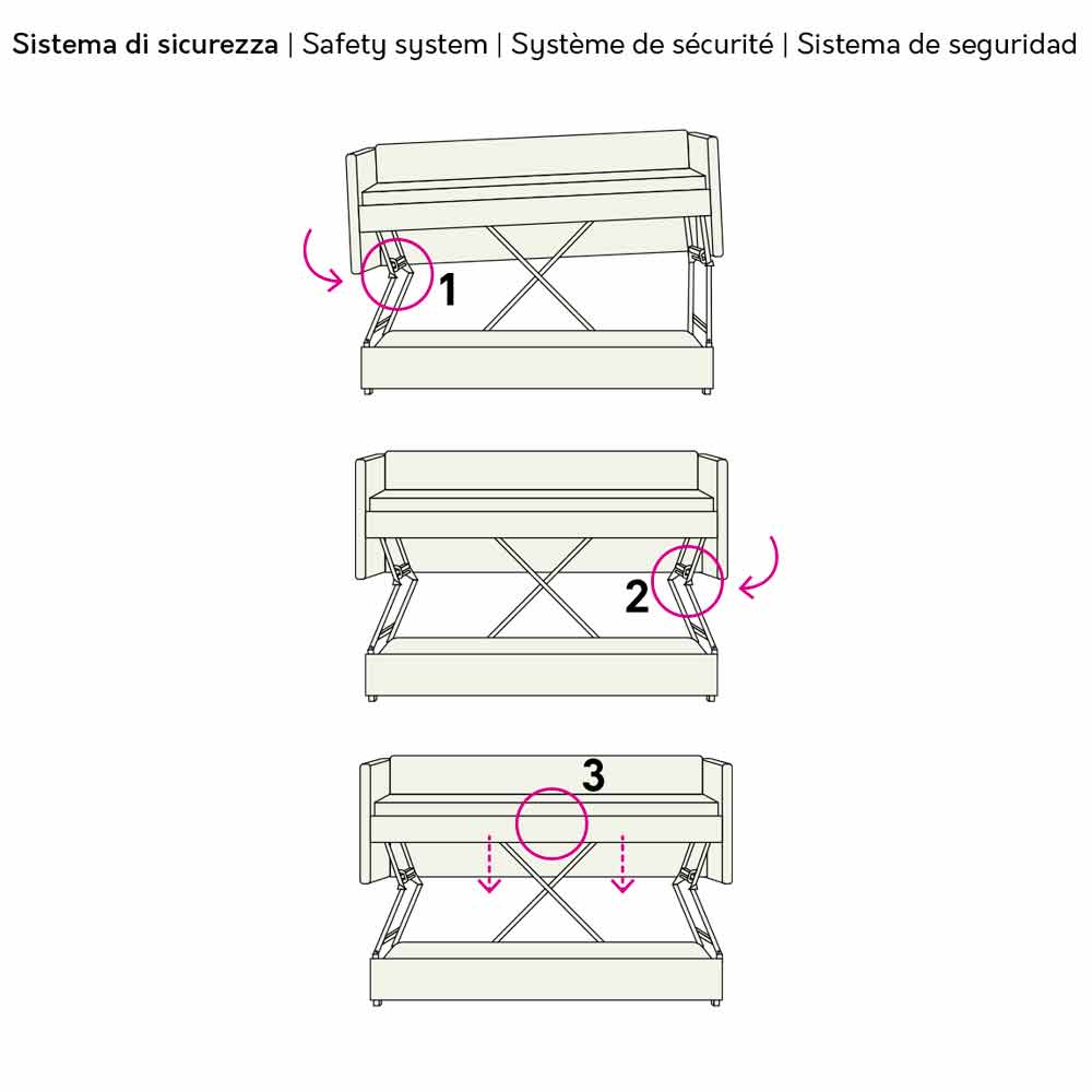 Sofá cama litera fabricado en Italia con relleno de espuma de poliuretano indeformable y funda de tela burdeos (completamente desenfundable) con edredón naranja. También incluye una red mecánica con un marco de tubo de acero que soporta el peso de dos adultos sin deformarse y 2 colchones de espuma de poliuretano indeformable (densidad 25 kg / m3). Una sorprendente solución de mobiliario que consigue transformarse en dos prácticas y cómodas literas en un mismo espacio. Una idea completamente innovadora que ofrece la posibilidad de acoger a amigos y familiares incluso a quienes disponen de pequeños espacios. Funcionalidad y diseño se unen para dar vida a un complemento único con una fuerte personalidad moderna capaz de caracterizar cualquier ambiente gracias a su alma revolucionaria. Del sofá a la cama, un simple gesto es suficiente gracias al mecanismo de apertura fácil y rápido dotado de 3 niveles de seguridad mientras que para cerrarlo bastará con soltar los dos soportes laterales, que permanecerán bloqueados hasta que también se suelte el tope central. El sofá cama también está equipado con una práctica escalera y barandilla para una mayor garantía de seguridad.
