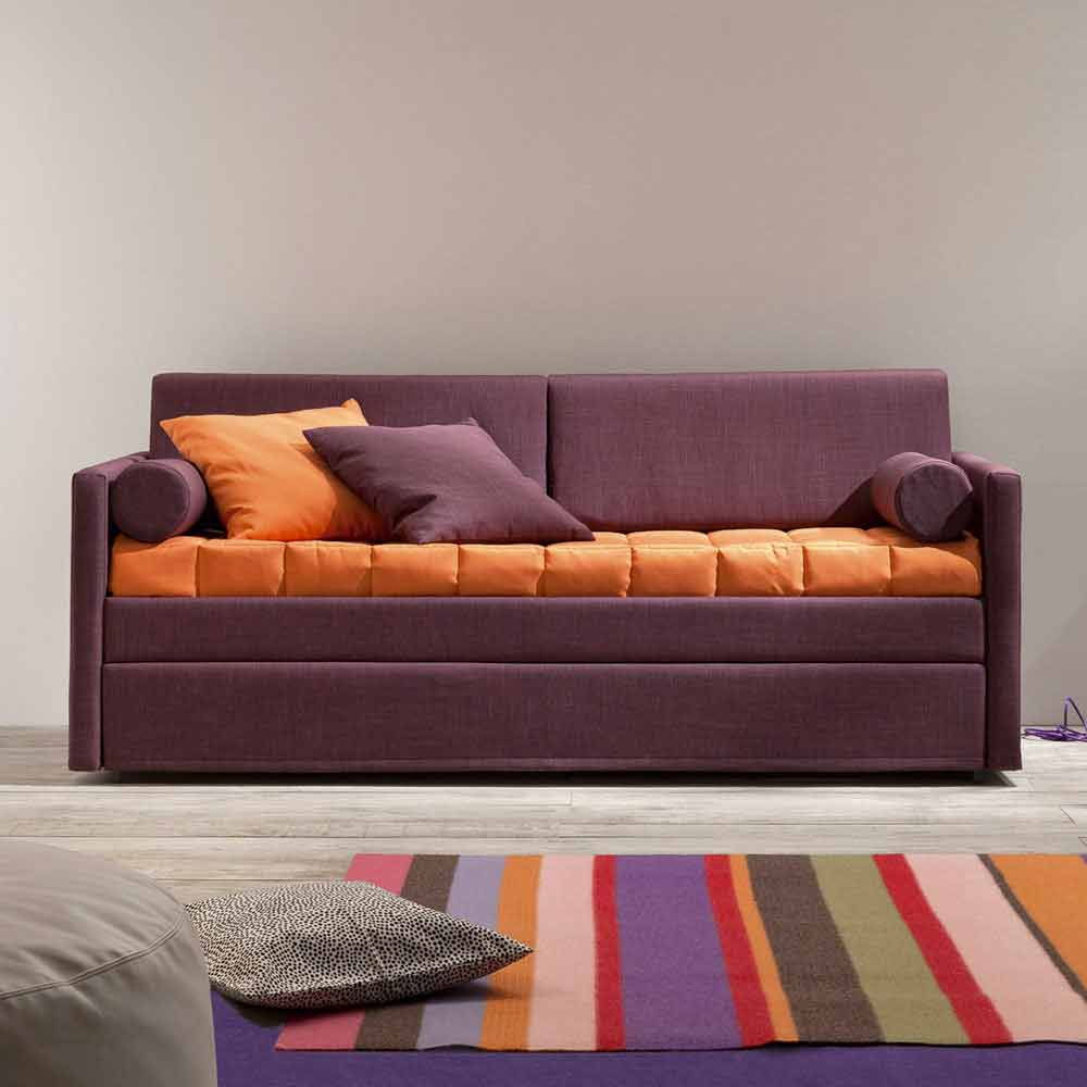 Sofá cama litera tapizado en tejido burdeos fabricado en Italia.