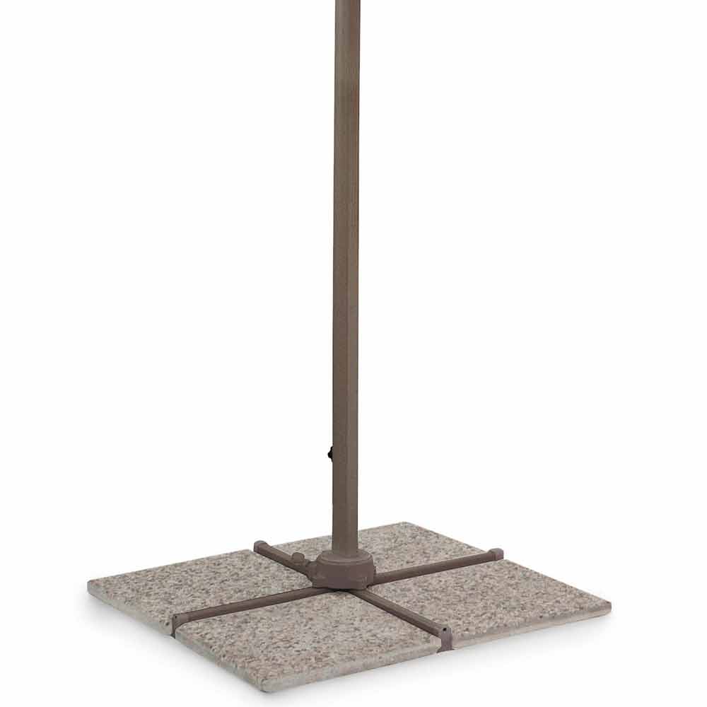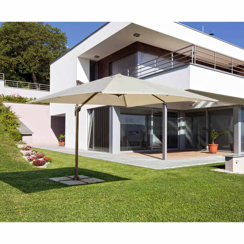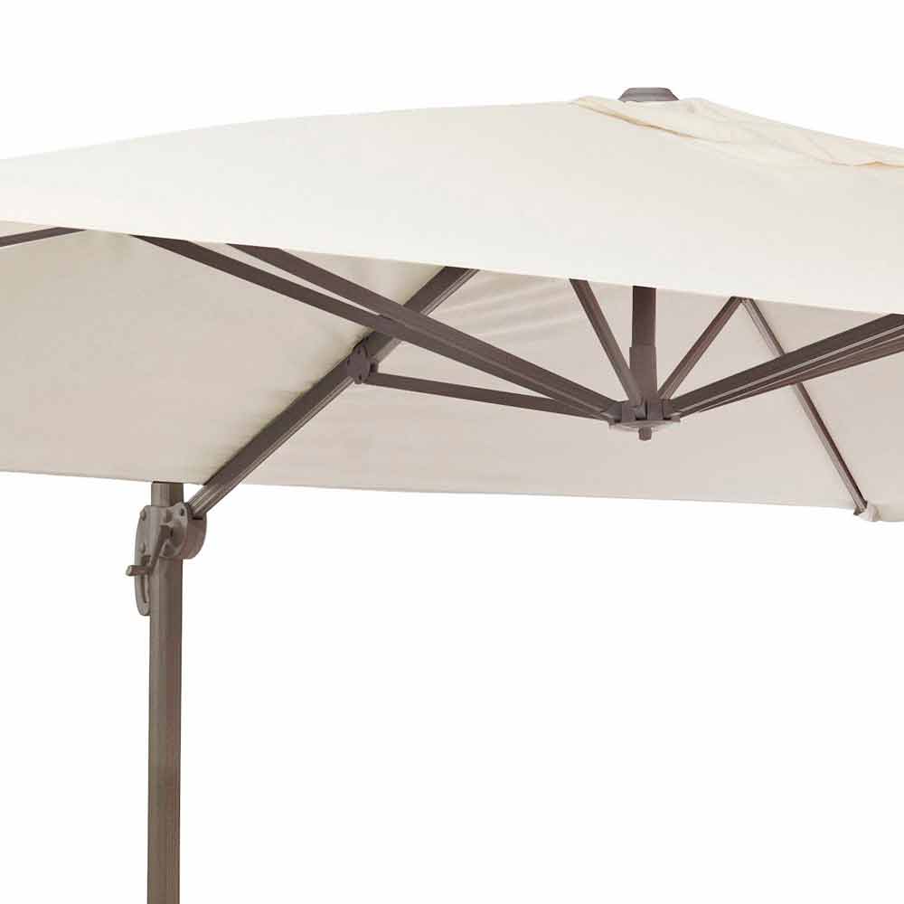 Estructura de aluminio pintado en polvo (poliéster). Poste de 53x77mm, poste suspendido de 25x40mm, 8 varillas de 14x24mm. Tejido poliéster natural 200gr / m2 con revestimiento de pa (poliamida). Base cruzada en acero . Poste giratorio manual de 360 °.