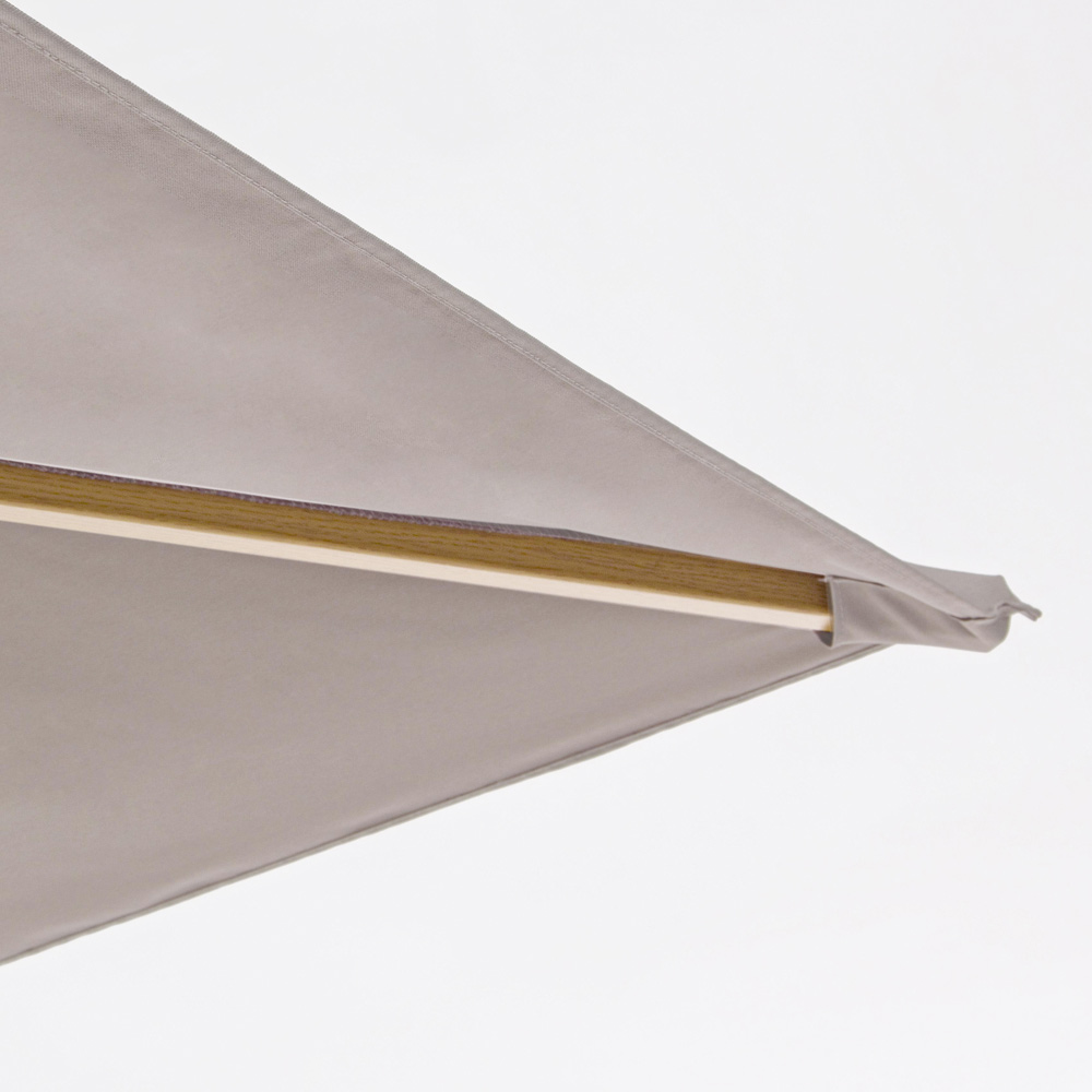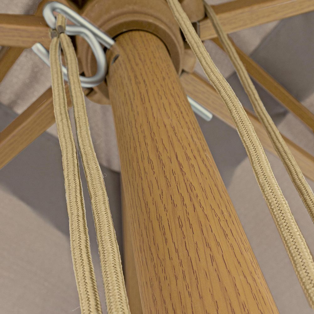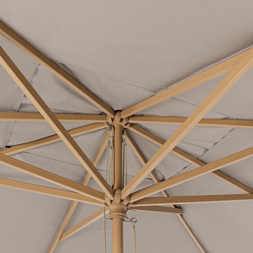 Estructura de aluminio con acabado efecto madera. Corona de plástico. Poste Ø48 x 1.8 mm. 8 varillas 20x30 mm. Lámina de poliéster de 235 gr / m2.