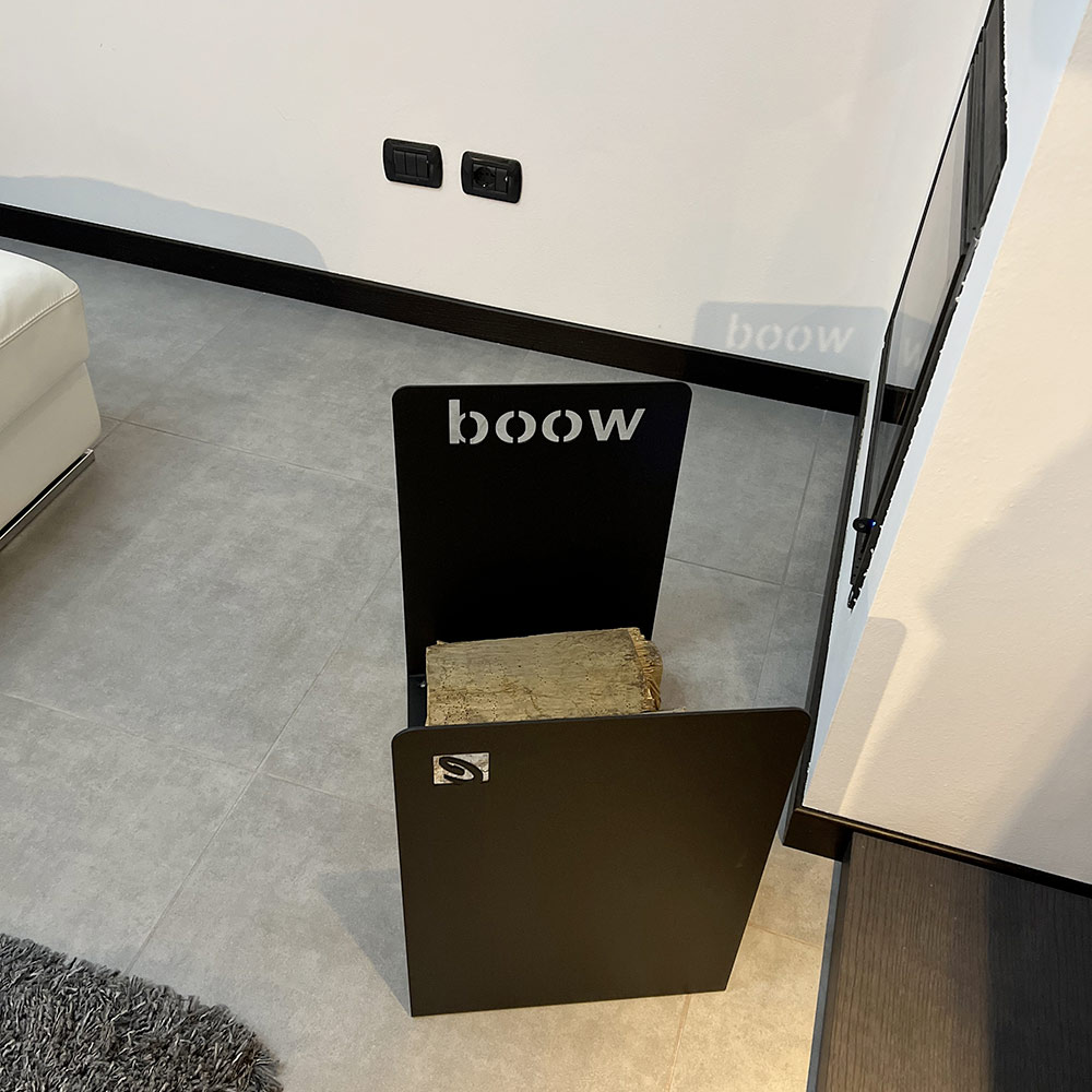 Porta leños bajo de diseño moderno y minimalista para la chimenea interior en acero negro con incisión lateral, made in Italy.