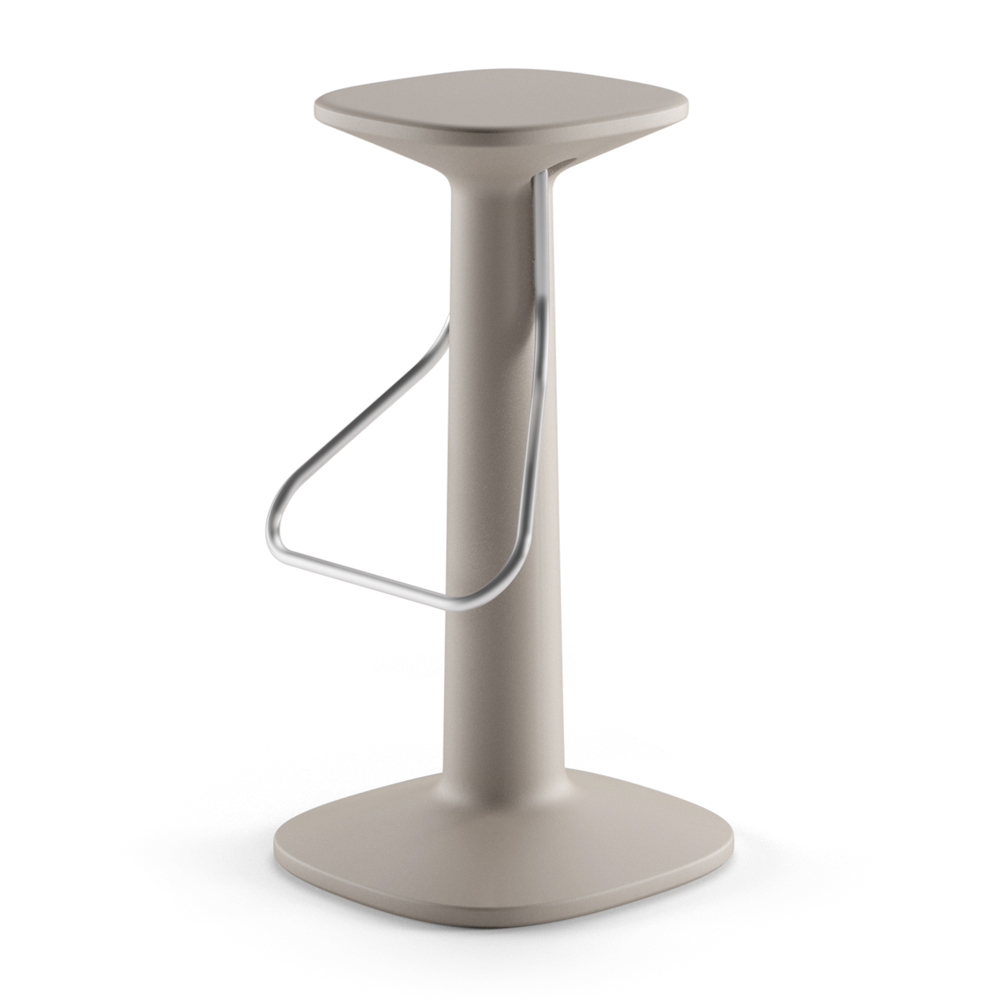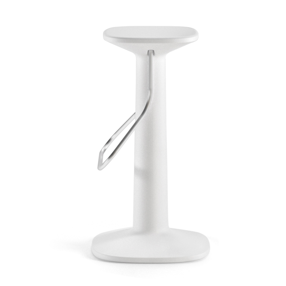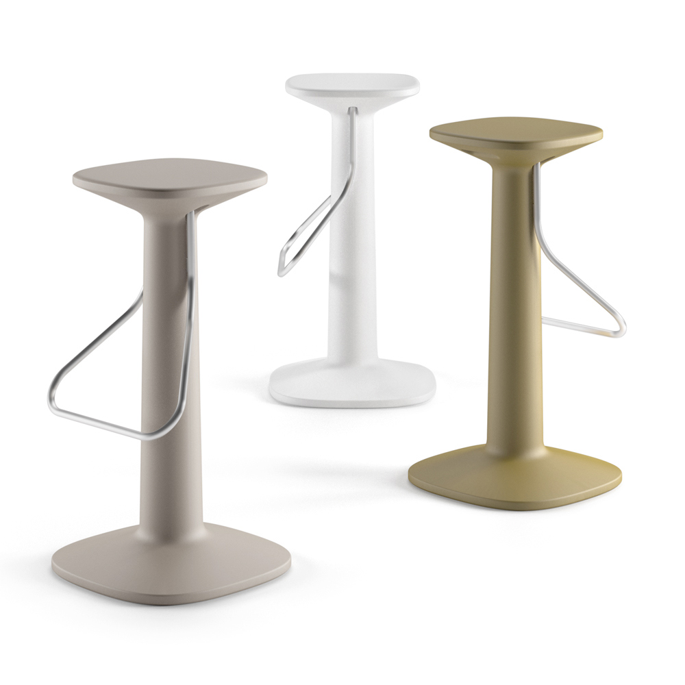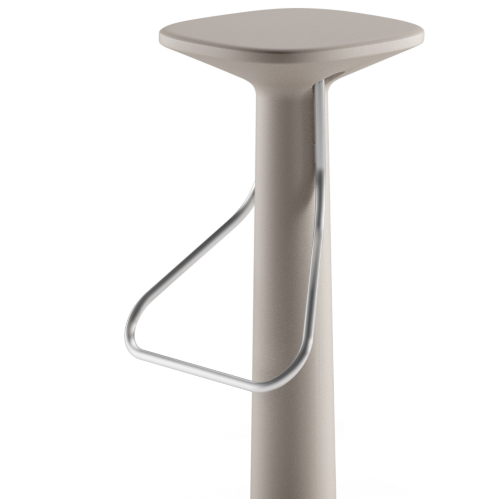 polietileno con acabado mate, lo que le aporta versatilidad y resistencia al calor, al sol y a los golpes, convirtiéndolo en el producto perfecto para ser utilizado también en ambientes exteriores. El taburete también cuenta con un práctico y cómodo reposapiés en acero inoxidable para hacer el producto aún más funcional. Ideal para completar el amueblamiento de ambientes con un diseño contemporáneo y minimalista, dando carácter y personalidad a la estancia.