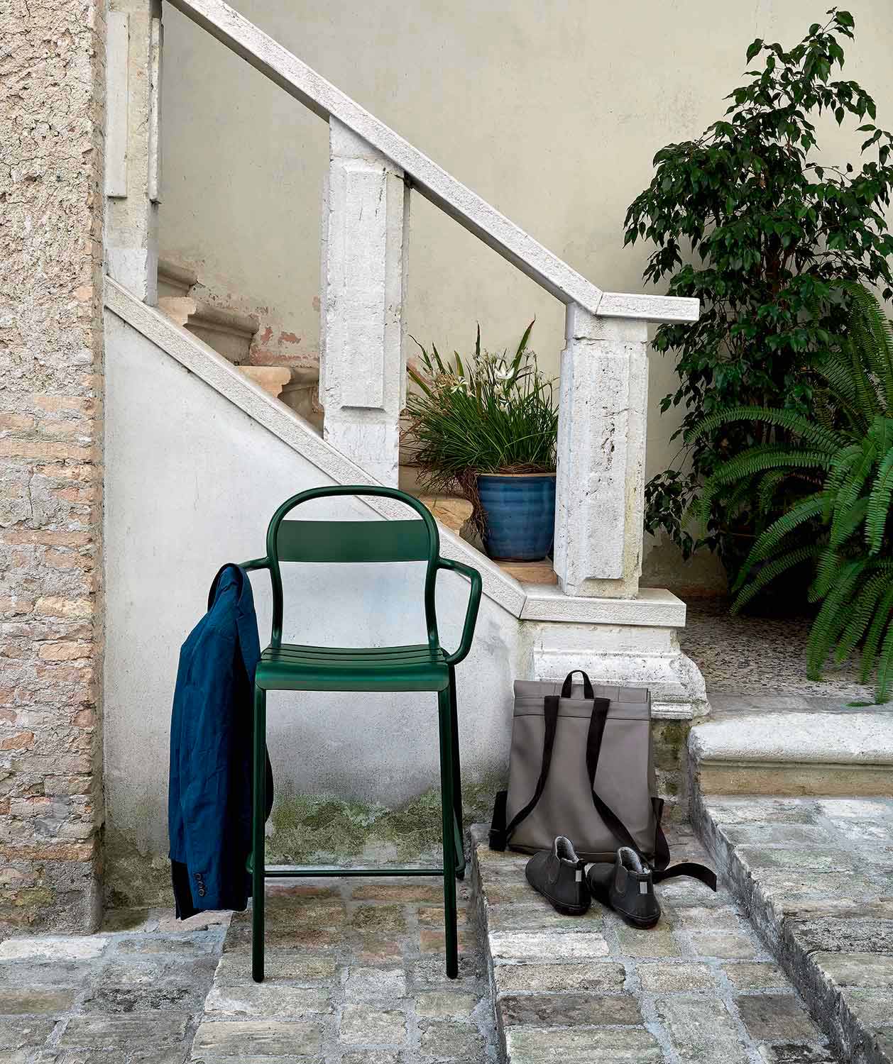 Taburete alto apilable de aluminio pintado para exteriores Hecho en Italia, 2 piezas.