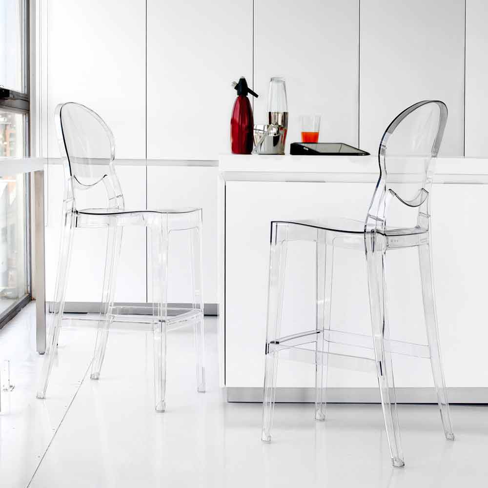 Taburete Bosa, fabricado en policarbonato transparente, diseño moderno.