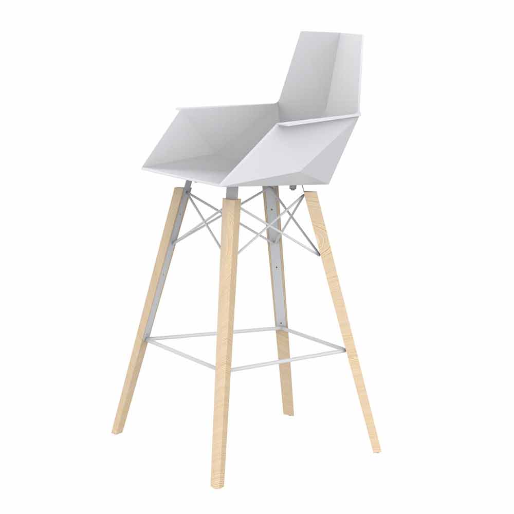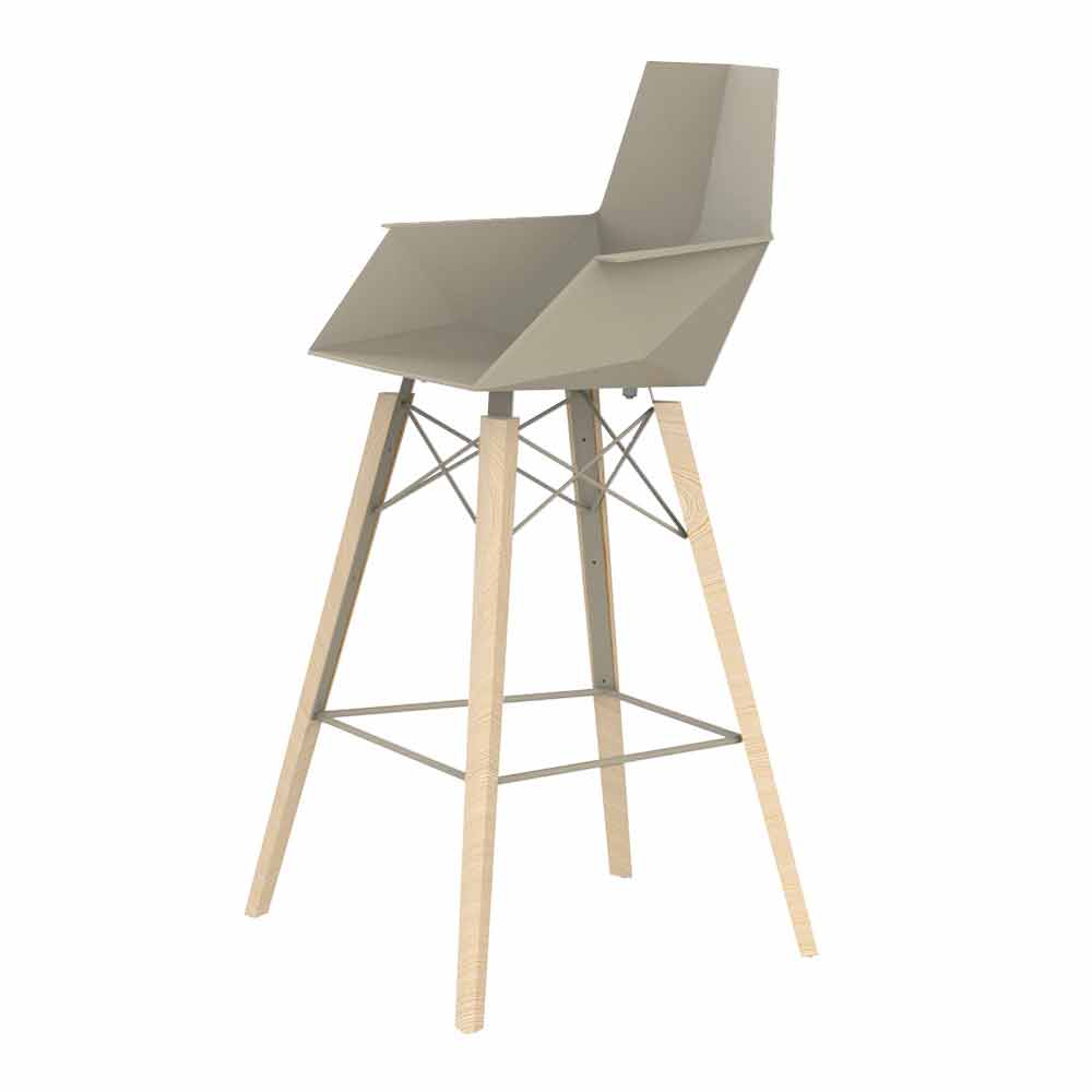 Taburete de bar con estructura en madera de fresno y asiento y respaldo y apoyabrazos en polipropileno en varios colores.