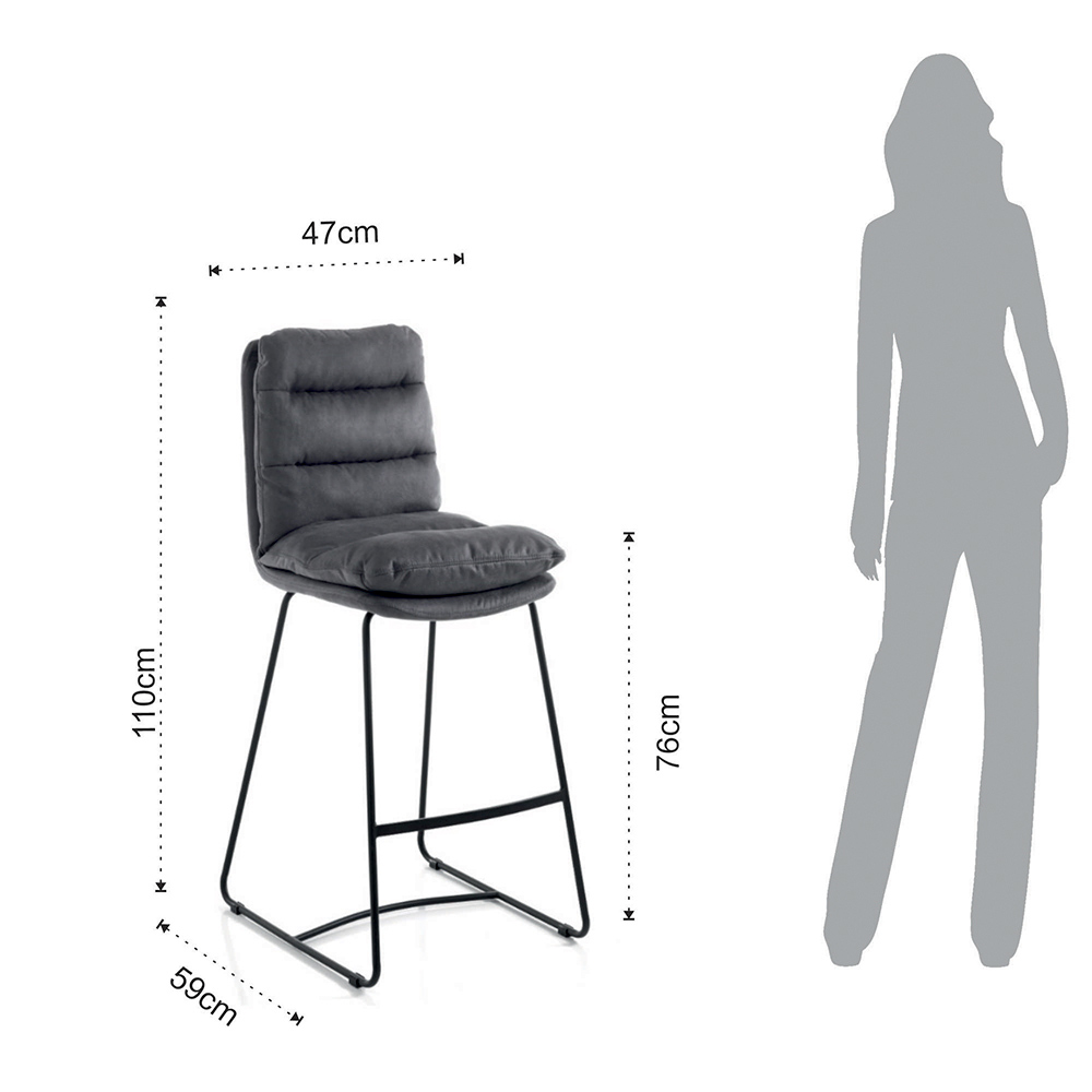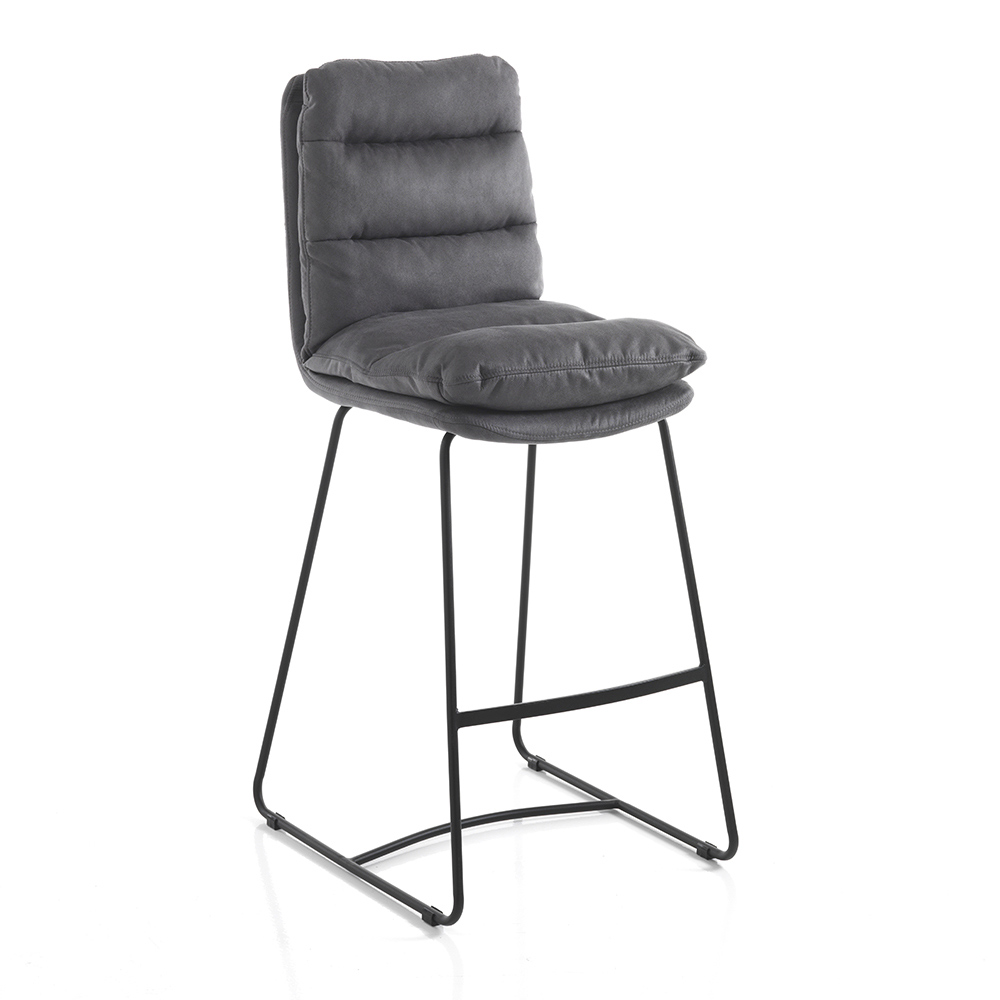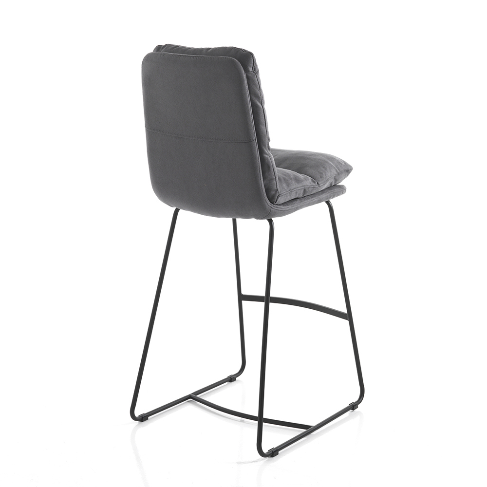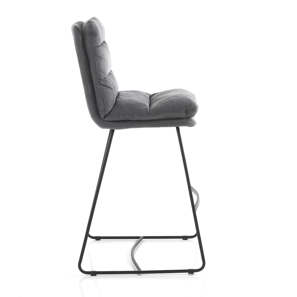 Taburete alto de cocina con estructura de patín fabricado en acero pintado negro mate con práctico reposapiés y asiento acolchado tapizado en suave microfibra efecto terciopelo gris . Un producto cuya estética está marcada por líneas simples y formas enriquecidas por el elegante acolchado que cubre todo el asiento, dando aún más una maravillosa sensación de confort. Ideal para colocar en el comedor y la cocina pero también en espacios contract como bares y restaurantes gracias al diseño elegante y refinado y su versatilidad de uso.