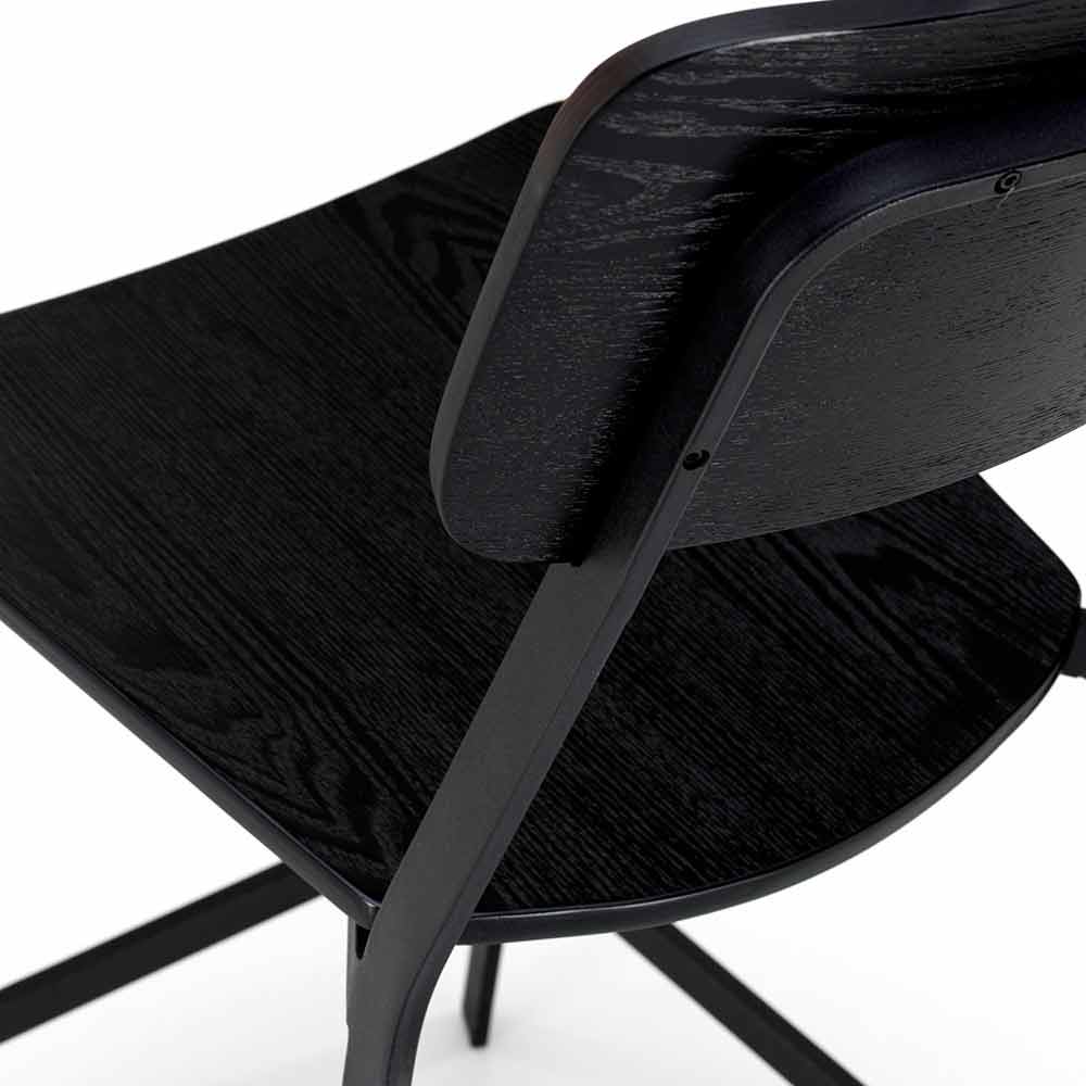Fabricado con estructura de metal pintado de negro y con cuerpo y asiento de madera pintado de negro.