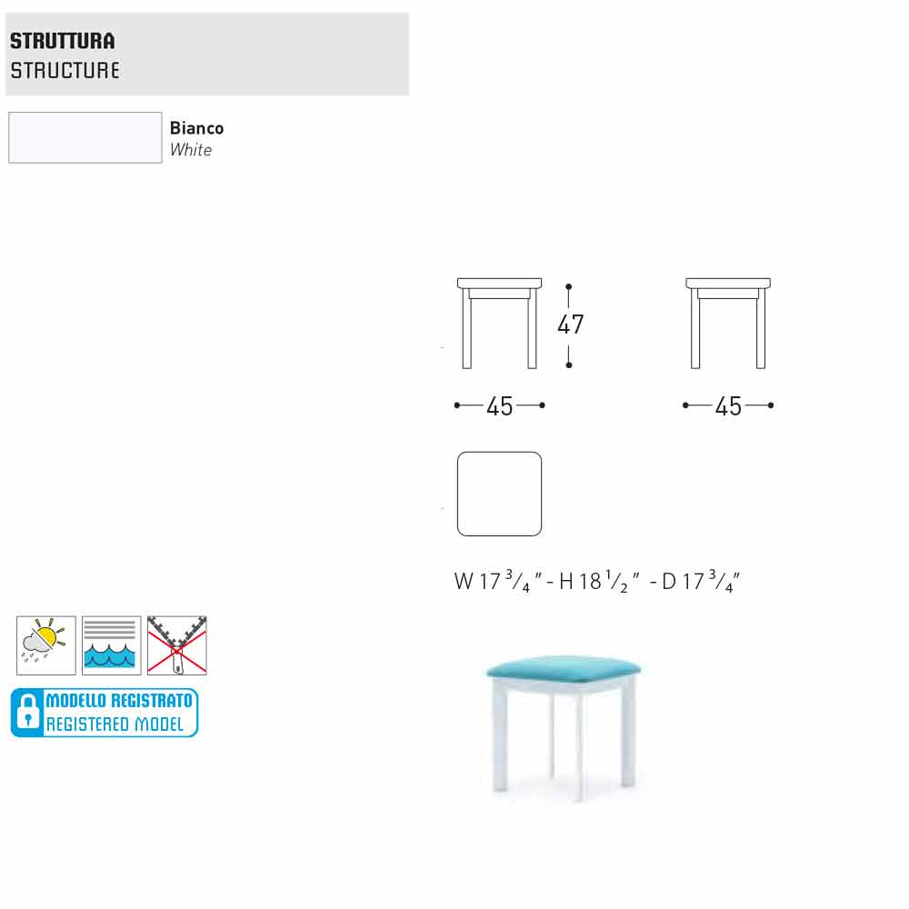 El sistema es un encantador taburete para exteriores con una estructura de aluminio recubierto de polvo blanco con asiento de tela tapizado disponible en diferentes variantes de tela.