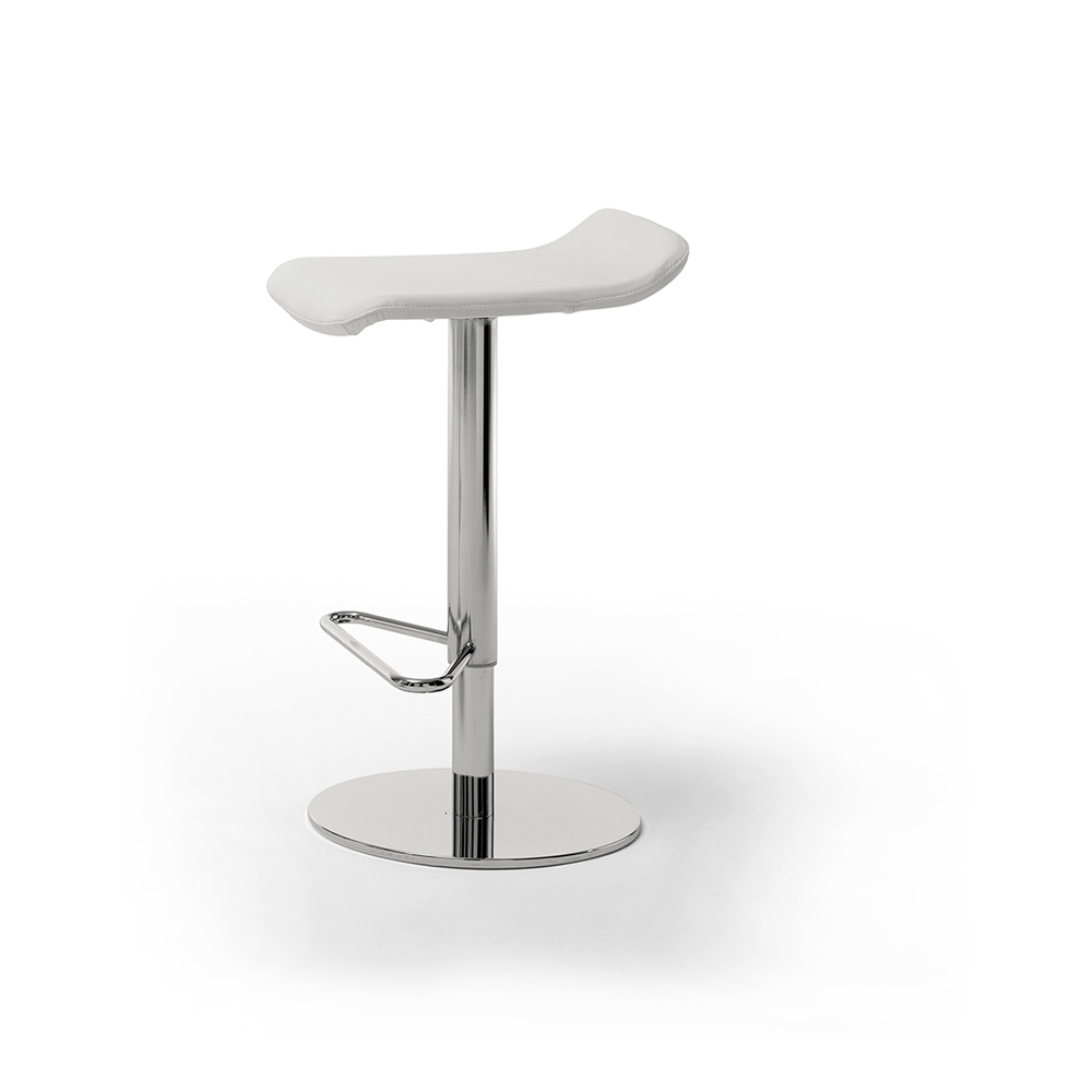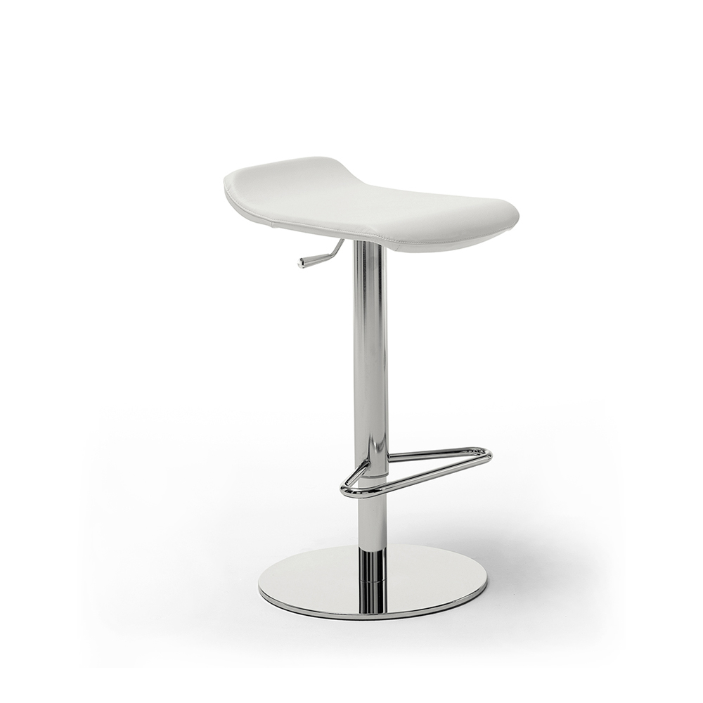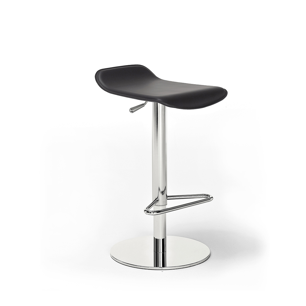 Peck es un taburete con asiento de madera contrachapada con una base redonda de acero cromado. Está cubierto en cuero o piel y tiene un elevador ajustable .