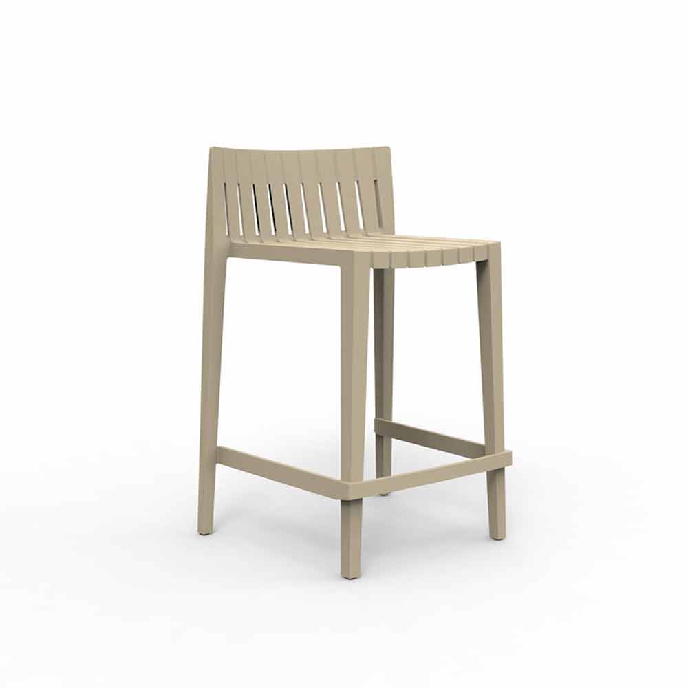 El taburete de jardín, con líneas definidas, es de polipropileno y fibra de vidrio. Estos materiales son resistentes al impacto y estabilizadores UV.