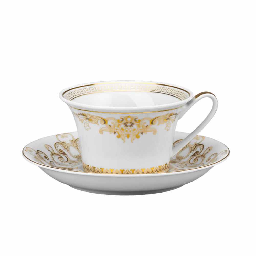 Este juego de 6 tazas de té contiene todo el refinamiento y el lujo de la nueva colección de vajilla Medusa Gala , que reinterpreta los motivos tradicionales de Versace en su diseño y decoración: el icono que representa a Medusa se alterna con refinados ornamentos barrocos en una preciosa filigrana de oro. Un emocionante efecto de contraste entre la blancura de la porcelana y el oro puro da vida a una mise en place perfecta, moderna y al mismo tiempo singular.