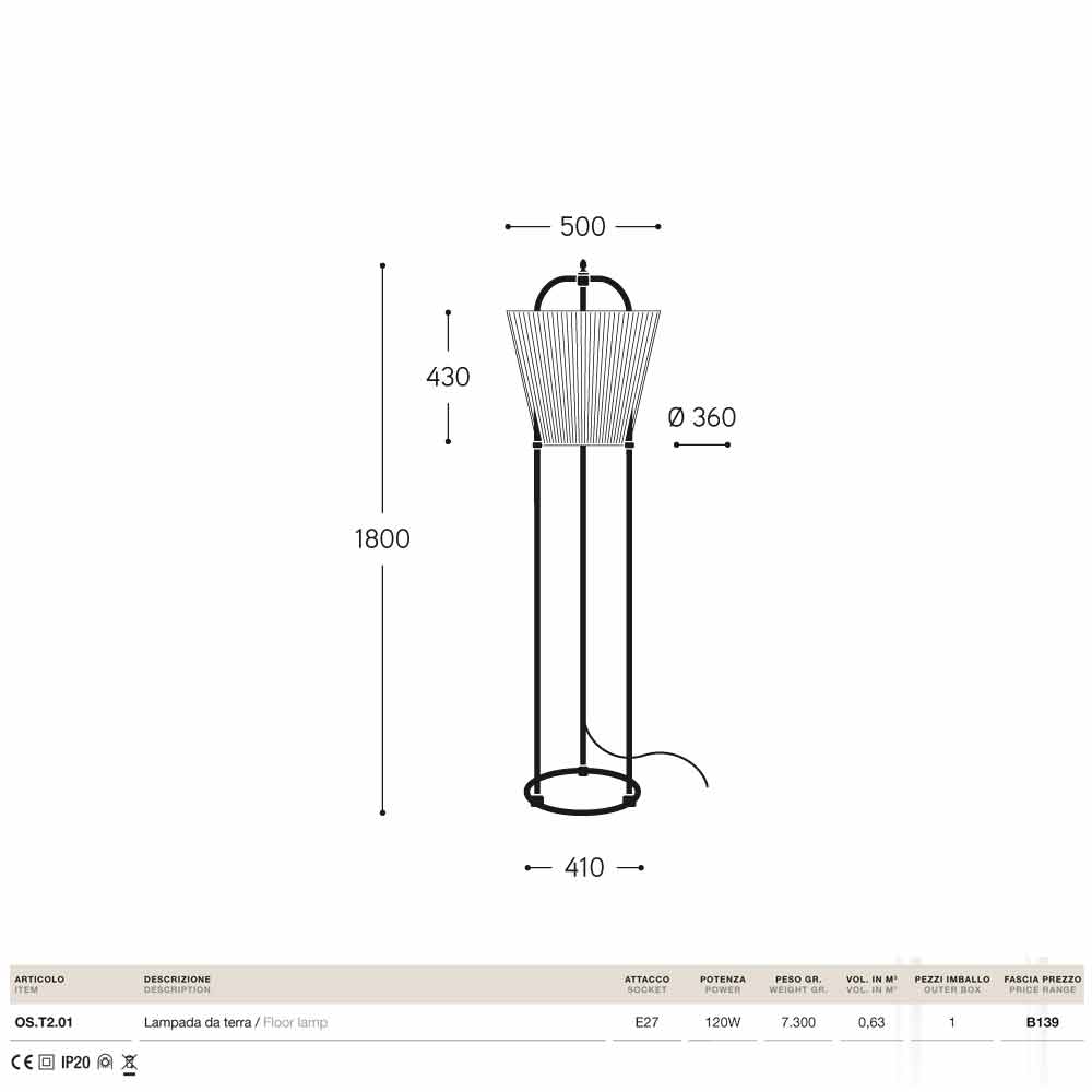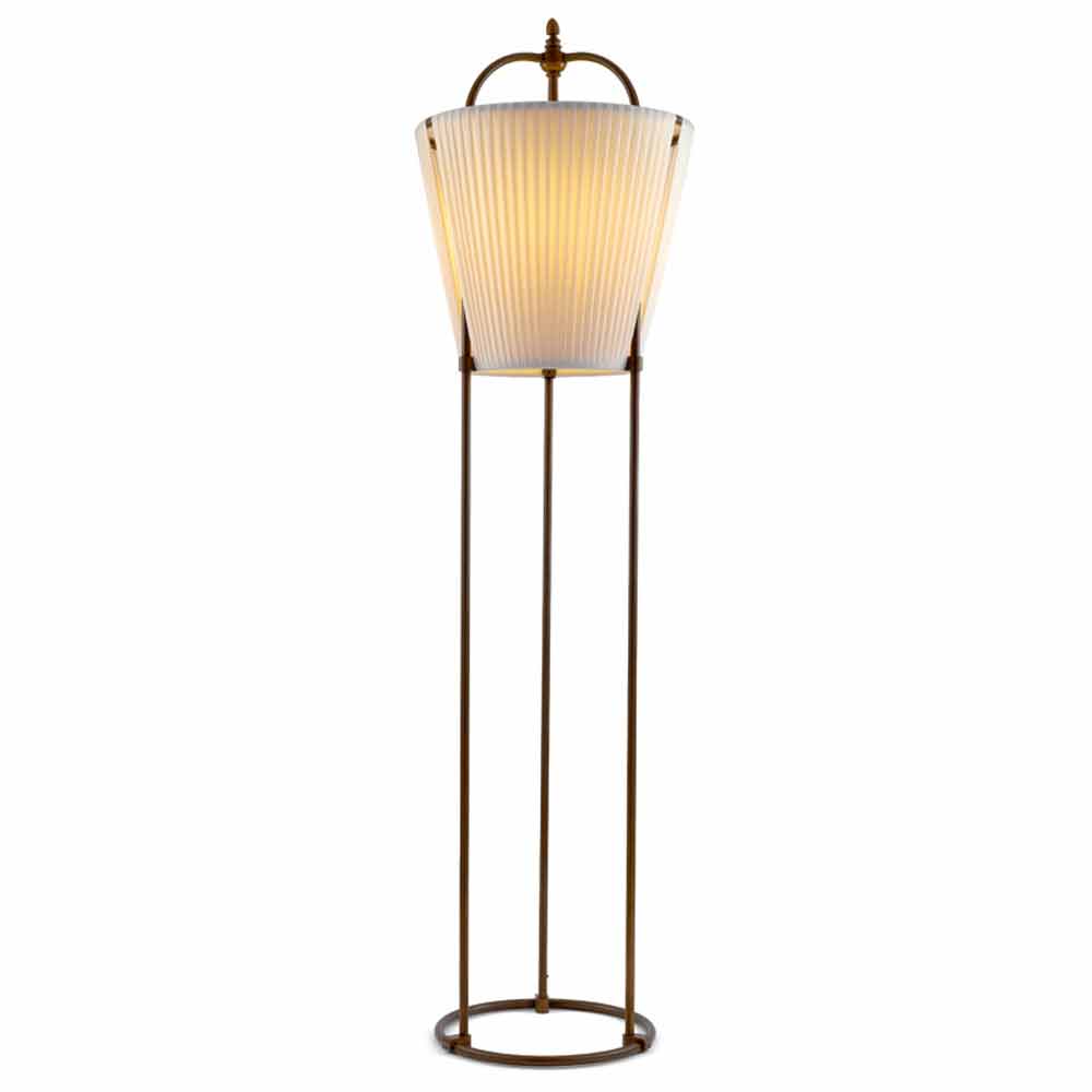 Lámpara de pie de diseño Tenarunga de Aldo Bernardi, realizada en latón envejecido y tejido.