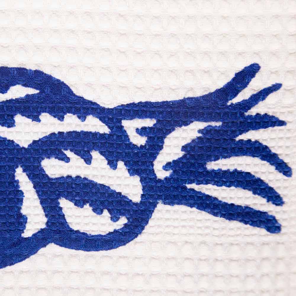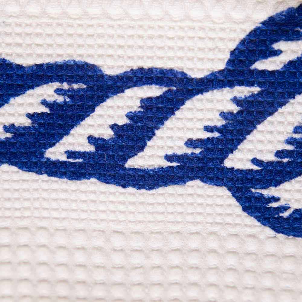Toalla de baño muy elaborada, estampada a mano en azul sobre algodón blanco con un antiguo dibujo de cuerda marítima con nudo, una pieza exclusiva de calidad Made in Italy.