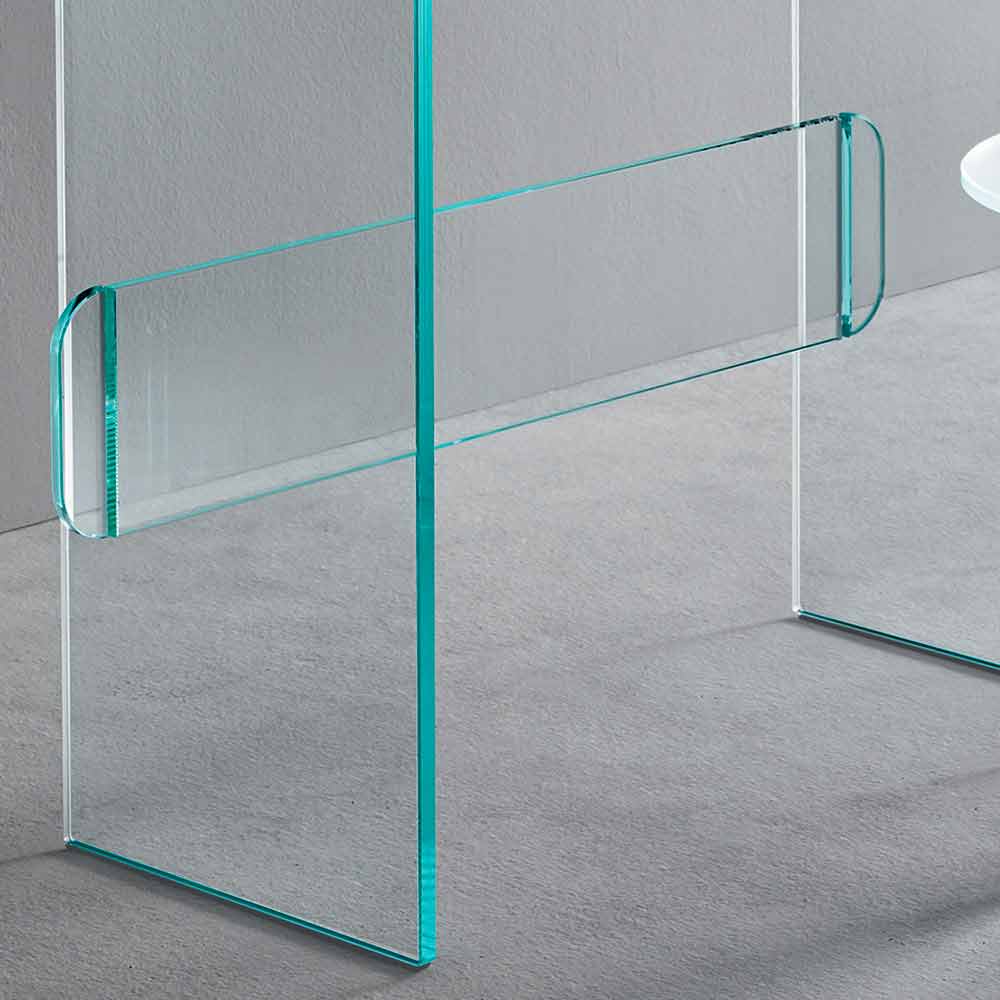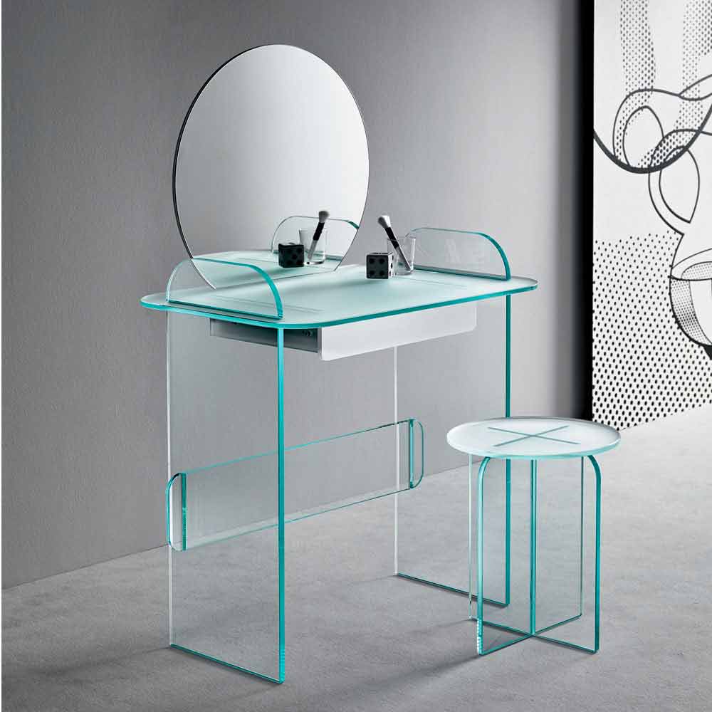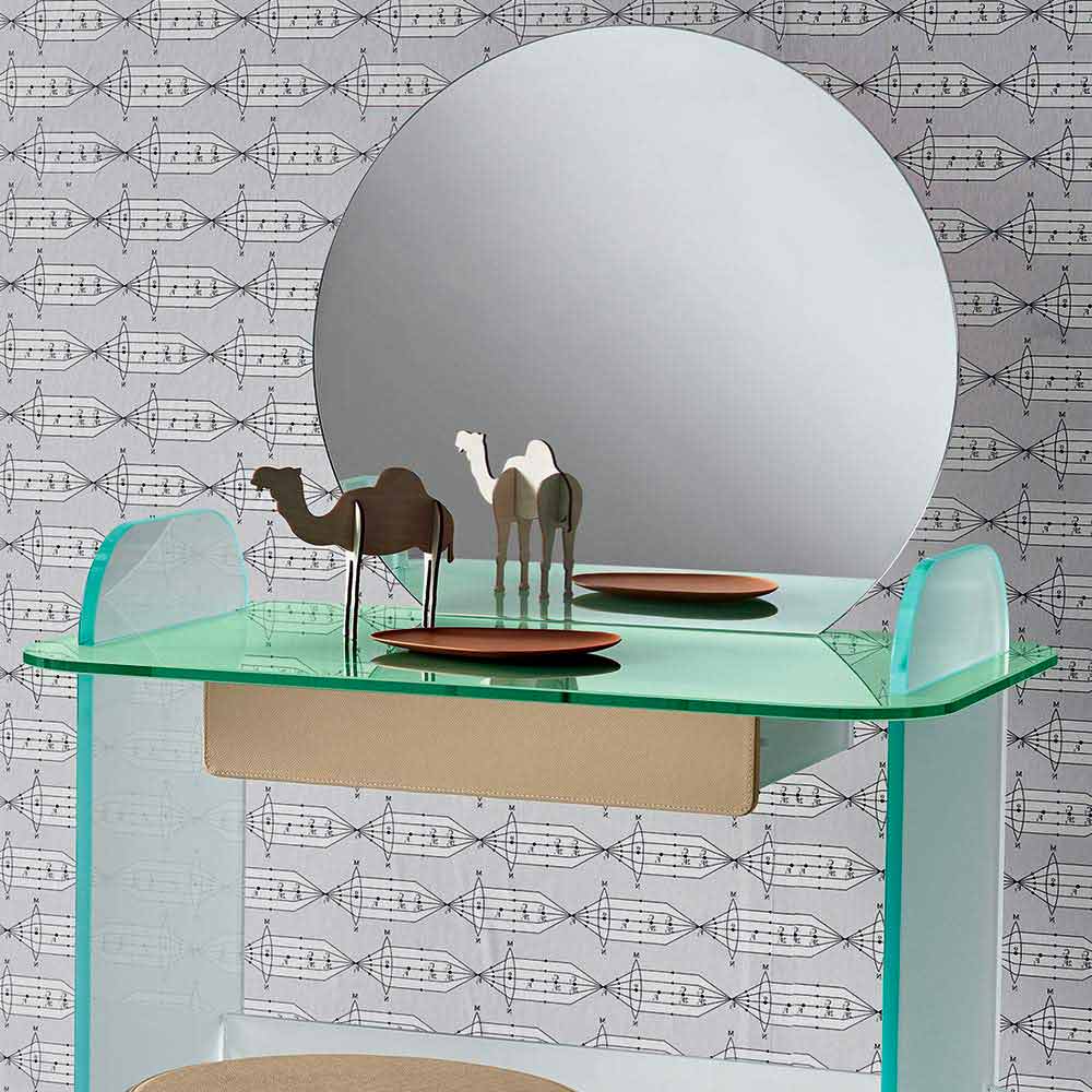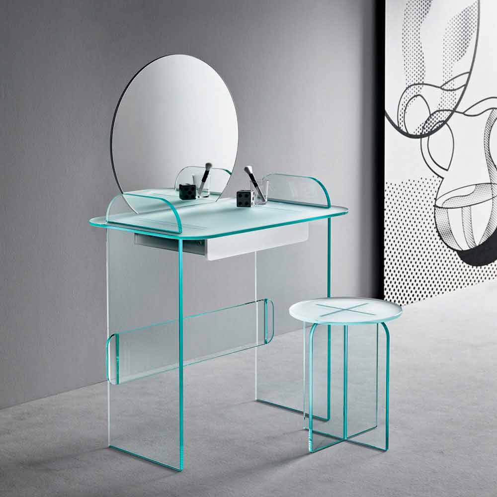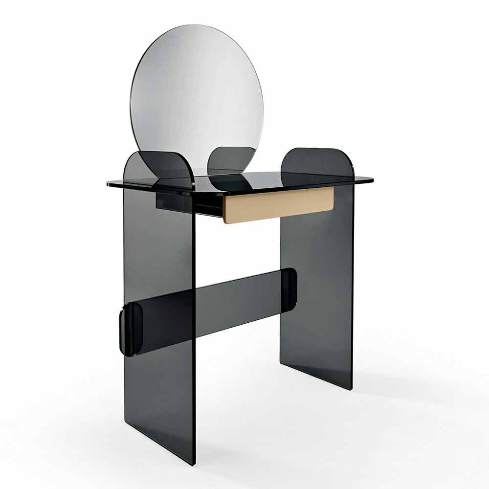 Símbolo de feminidad y refinamiento, este tocador tiene una estructura íntegramente en vidrio disponible en tres acabados y un cajón extraíble disponible en madera blanca mate o tapizado en piel beige.
