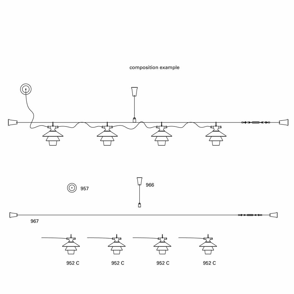A conectar al rosetón artículo 970 . Gracias al rosetón es posible crear interesantes composiciones de luz, combinando esta lámpara con las otras lámparas de suspensión de la colección: 951, 954-22 y 952.