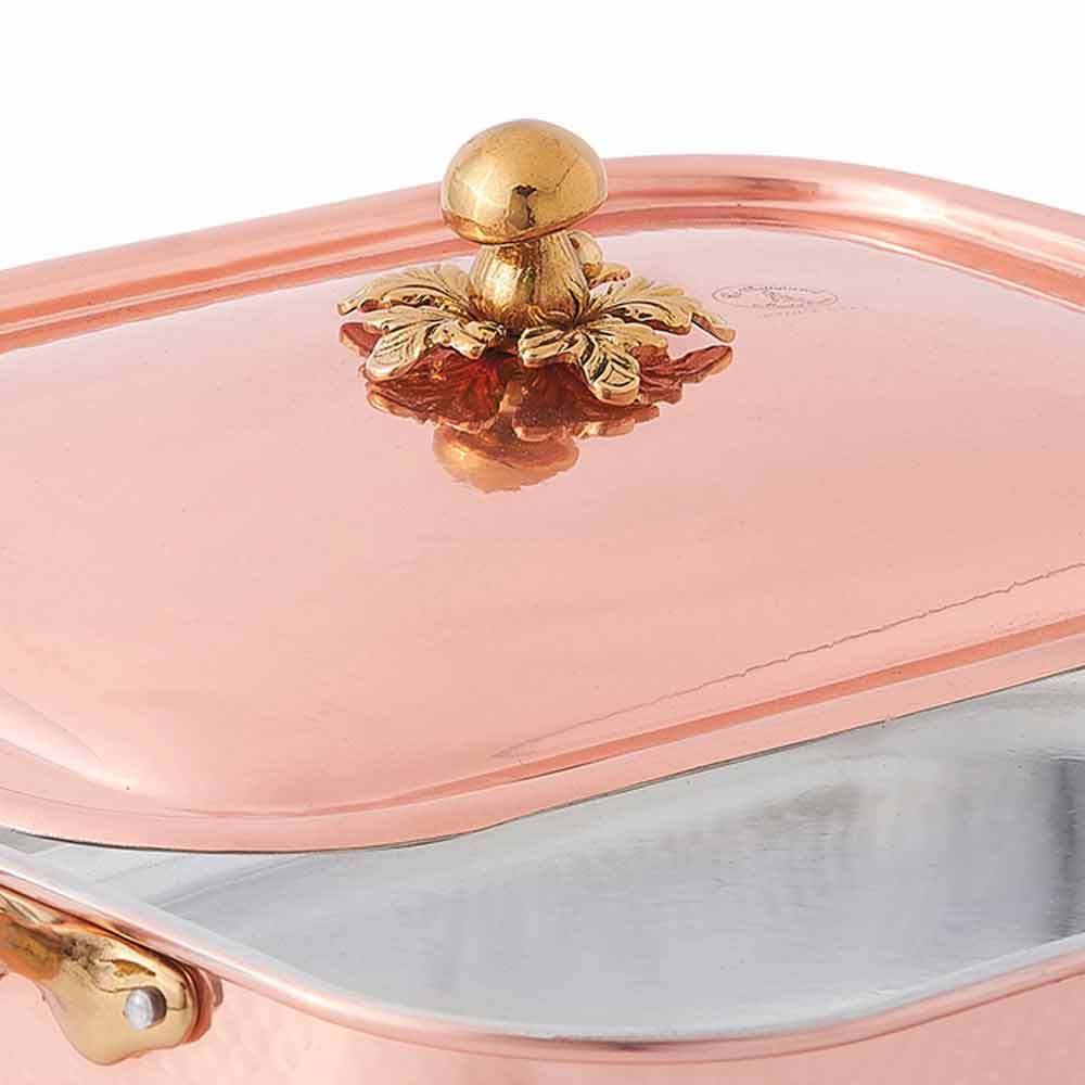 Tostador rectangular con tapa de cobre y asas de latón, fino diseño made in Italy.