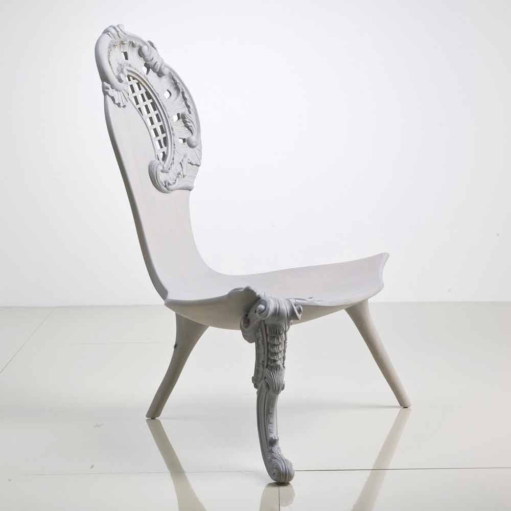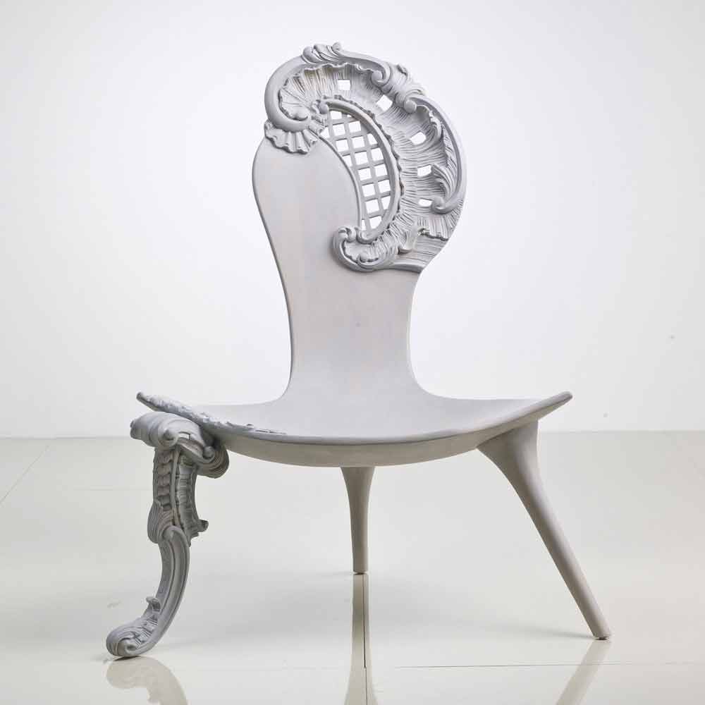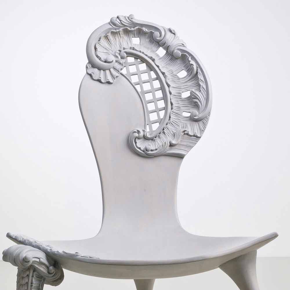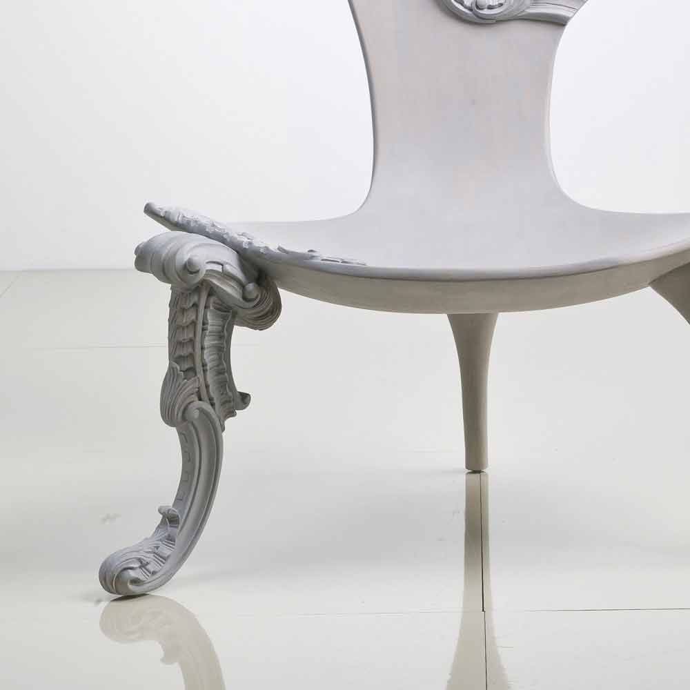 León es un trono tallado a mano en madera maciza con una decoración barroca en la parte posterior y un asiento de madera maciza. Una hoja de madera lisa perfila el perfil suave en algunas de sus partes evoluciona en un trabajo barroco floreciente. Casi como si la madera lentamente le quitara la vida, en el sillón crece una especie de sombrero floral con mucho velo, mientras que la pierna se enriquece con enrollados rizos de madera. Acabado de roble gris (gris humo).