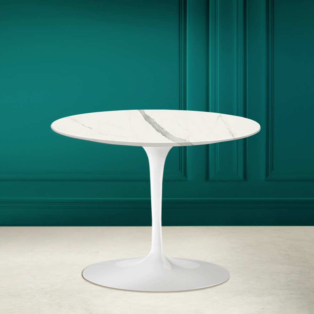 Mesa de centro redonda con tapa de cerámica estatuaria de veta completa y base de aluminio pulido Made in Italy