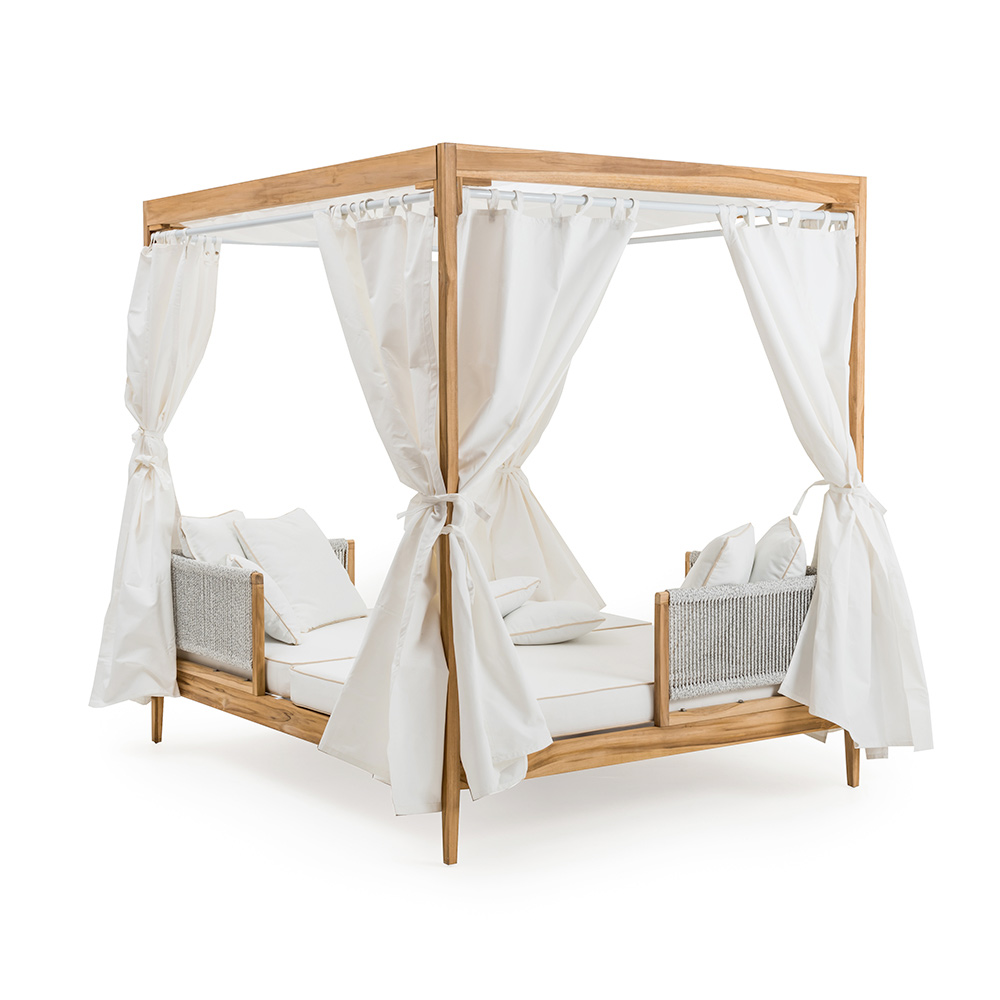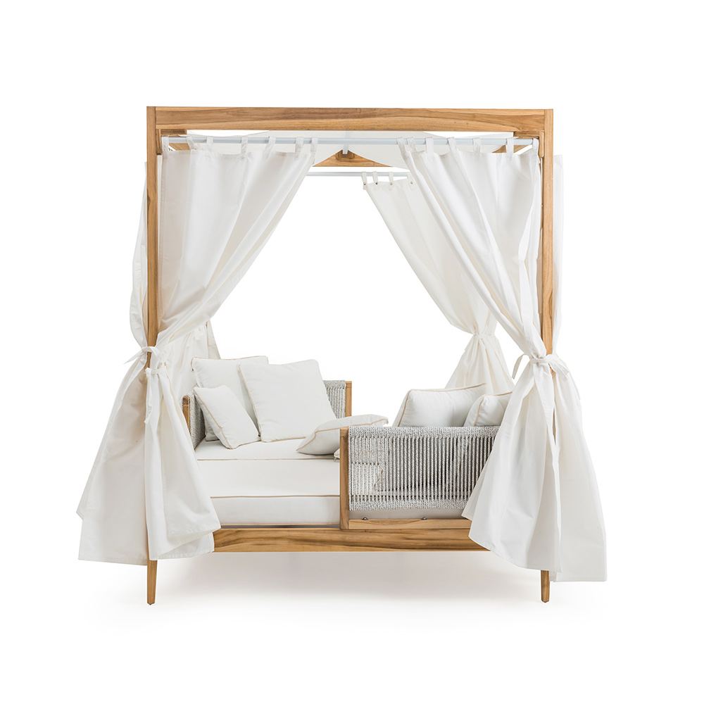 Un cama de día diseñado para aquellos que buscan un estilo sobrio y elegante que pueda dar a sus espacios exteriores un acento de frescura. Este toldo se presta a enriquecer impecablemente jardines, terrazas y porches, resultando también perfecto junto a la piscina, donde crea un maravilloso ambiente acogedor y una perfecta armonía con el entorno que lo rodea. Su refinado diseño lo convierte en un complemento perfecto para completar con carácter y estilo cualquier espacio exterior, tanto privado como contract, dando vida a un mobiliario exclusivo y detallista.