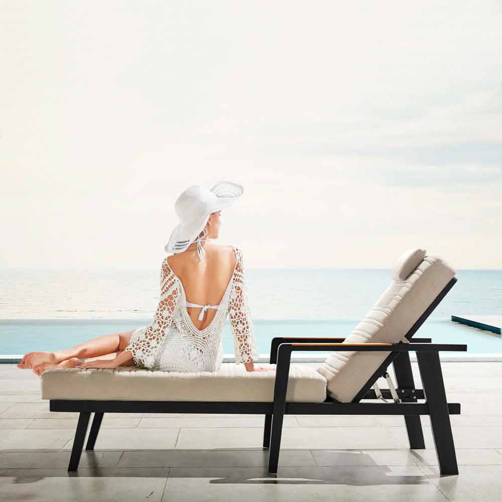 Esta tumbona se caracteriza por un diseño simple, lineal y elegante. Tiene una estructura de aluminio pintado en polvo gris antracita con apoyabrazos de superficie de madera de teca.