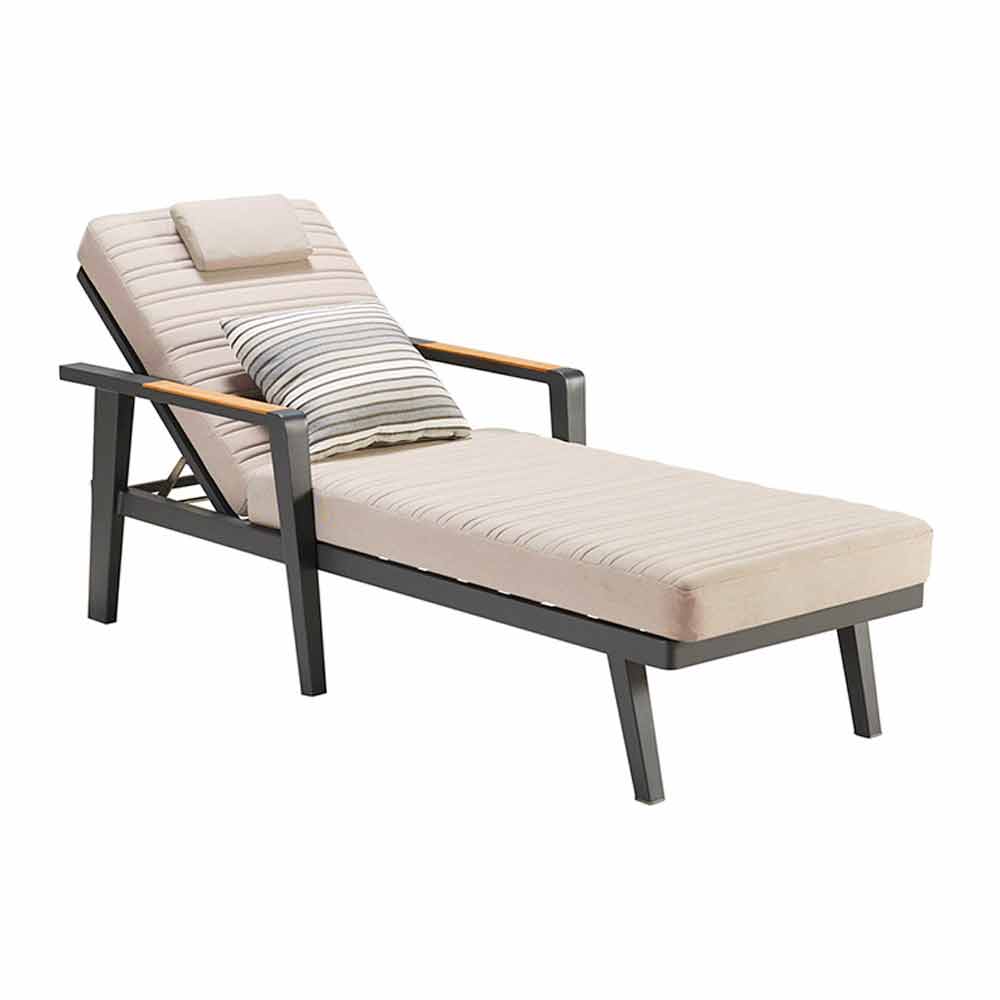 Tumbona tumbona de aluminio reclinable con reposabrazos y reposacabezas de teca.