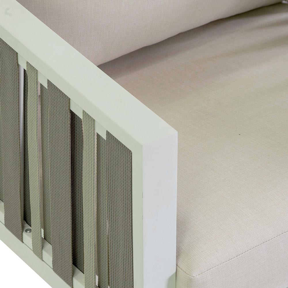 Líneas limpias y un diseño contemporáneo se mezclan con una selección de materiales de alta calidad, ofreciendo un aspecto elegante que eleva al instante cualquier espacio exterior. Los asientos están generosamente acolchados con cojines de tela resistentes a la intemperie, prometiendo un confort inigualable y un bajo mantenimiento.