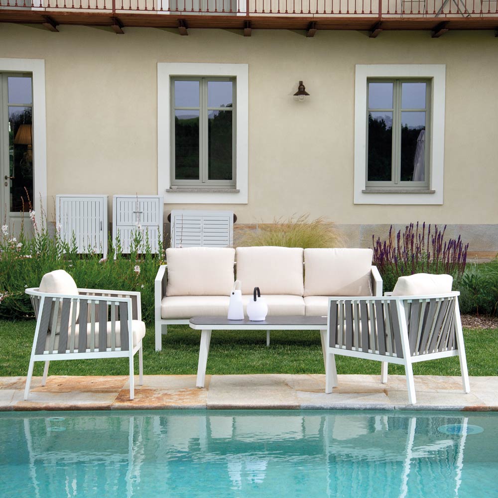 Con su tono neutro y su llamativo diseño, este salón es ideal para aquellos que buscan un ambiente refinado en el que relajarse o entretener a sus invitados al aire libre.